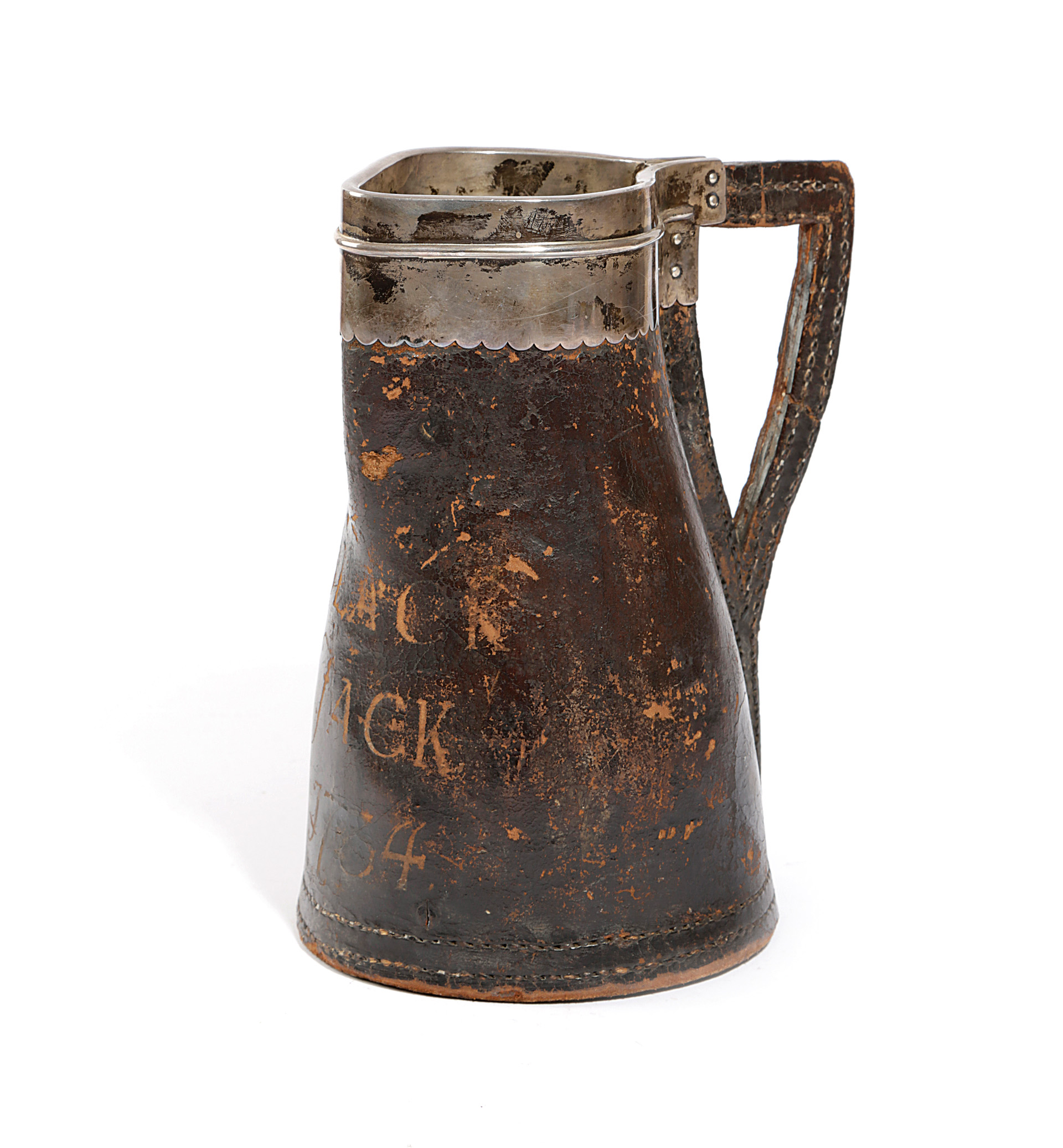 unmarked, the rim with pendant lappets, with an angular handle and stitched edges, the front inscribed 'Black Jack 1784'