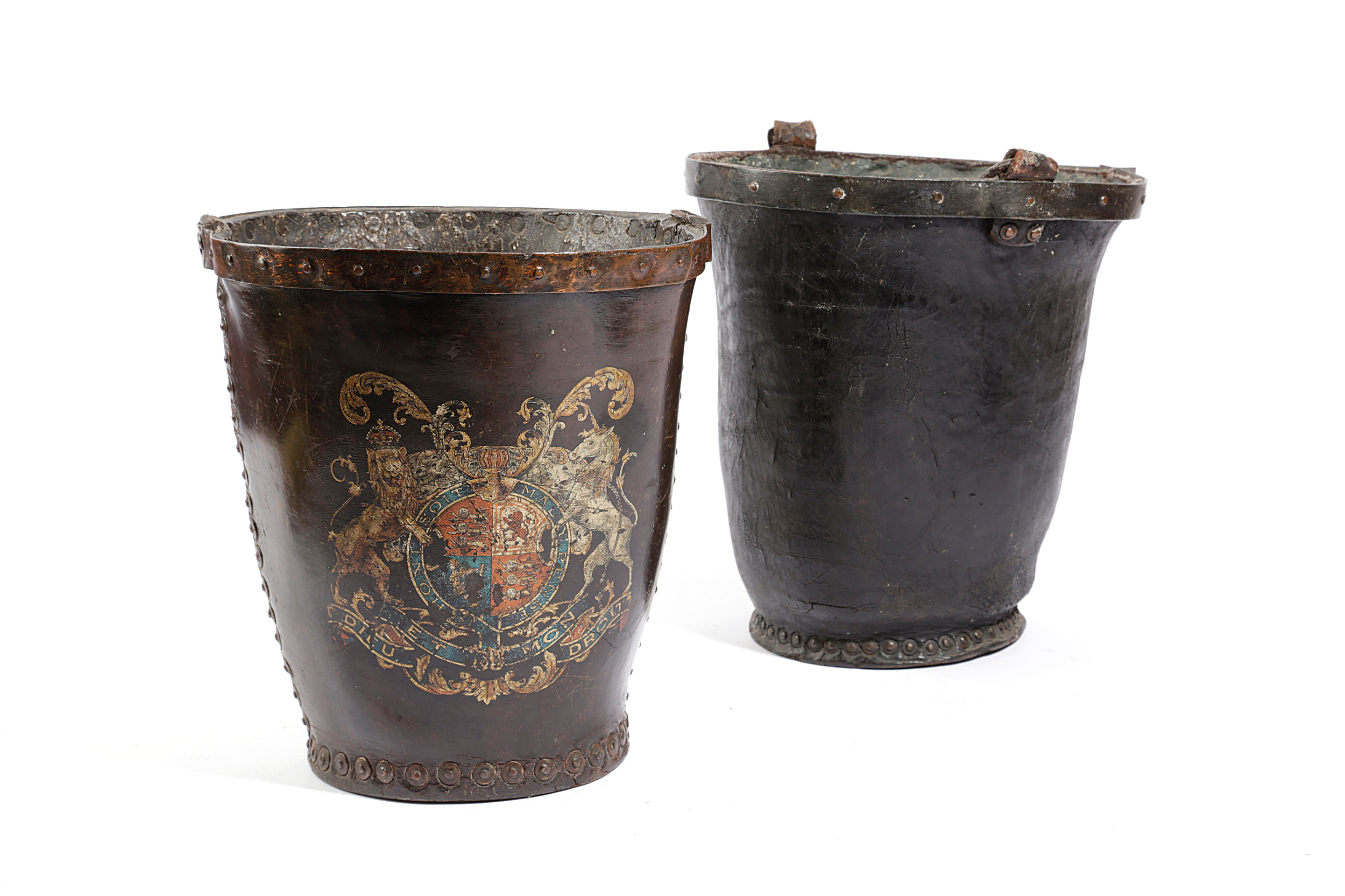 one emblazoned with the Royal Coat of Arms, the other with a strap handle (broken), both riveted and with copper rims (2)