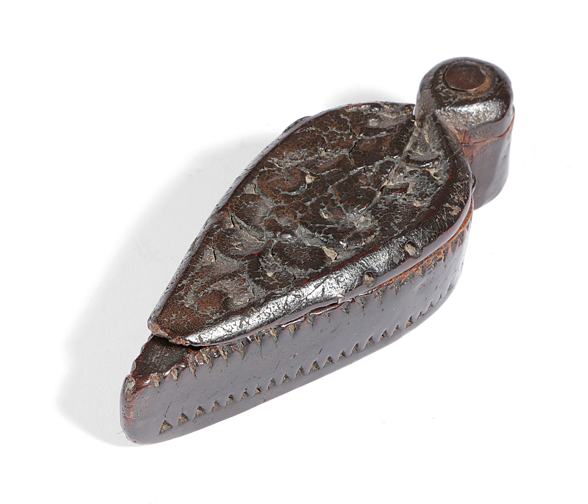 the swivel lid carved with a leaf design, revealing a divided interior with a circular recess, the body with a chip carved 'tooth' bands