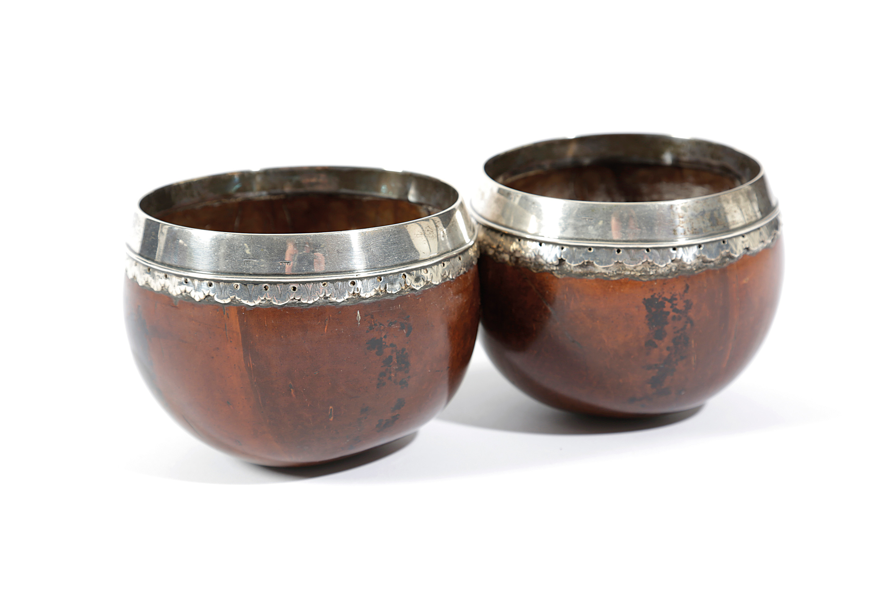 TWO TREEN SILVER MOUNTED COCONUT DIPPER CUPS