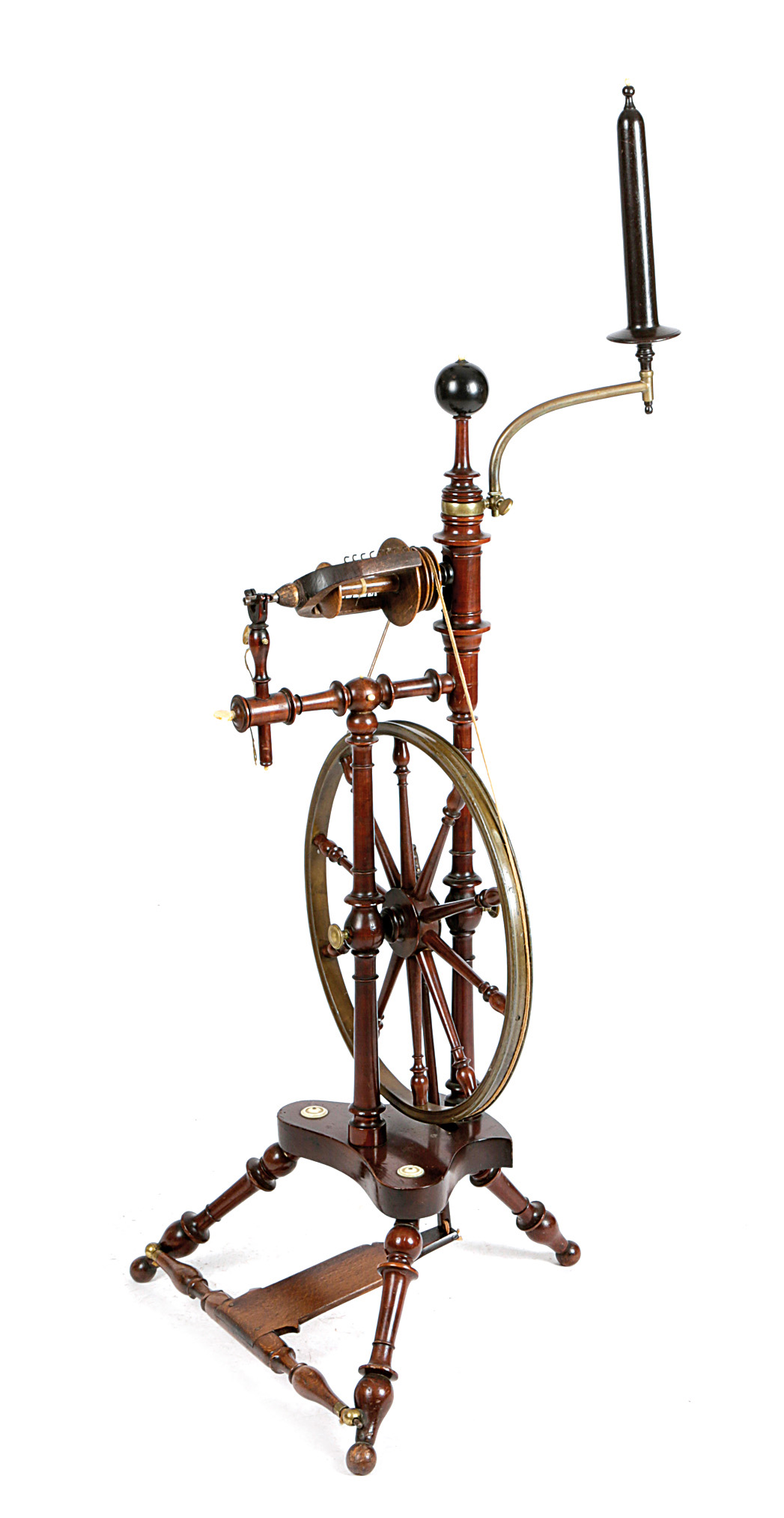 A FRUITWOOD AND BEECHWOOD SPINNING WHEEL