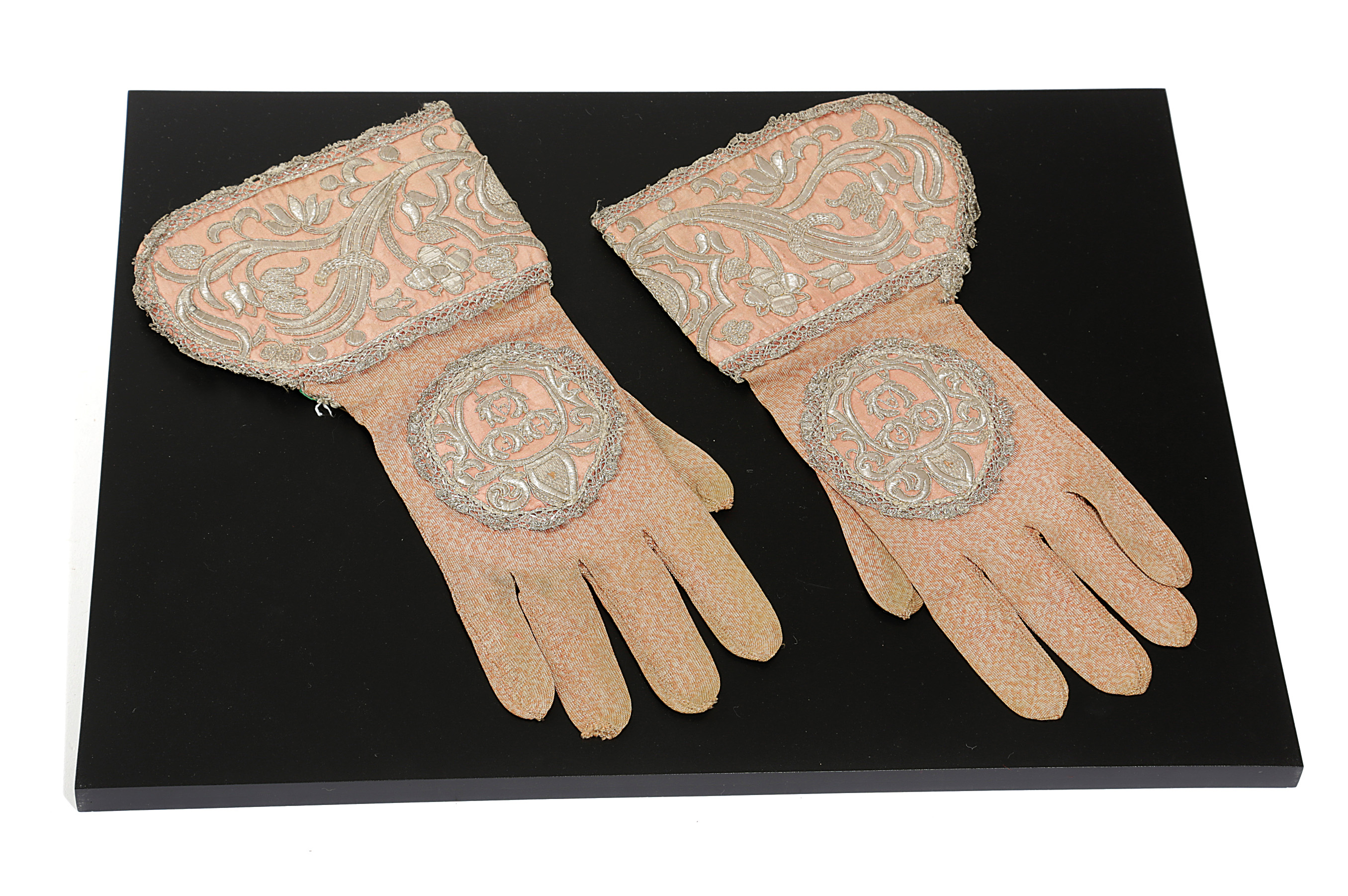 worked with silk yarn, silver metal thread and lace, in satin and couching stitches on knitted silk and damask ground, decorated with scrolling foliage to the cuffs and a circular medallion to the hands, with a bishop's crest, displayed in a modern Perspex case (2)