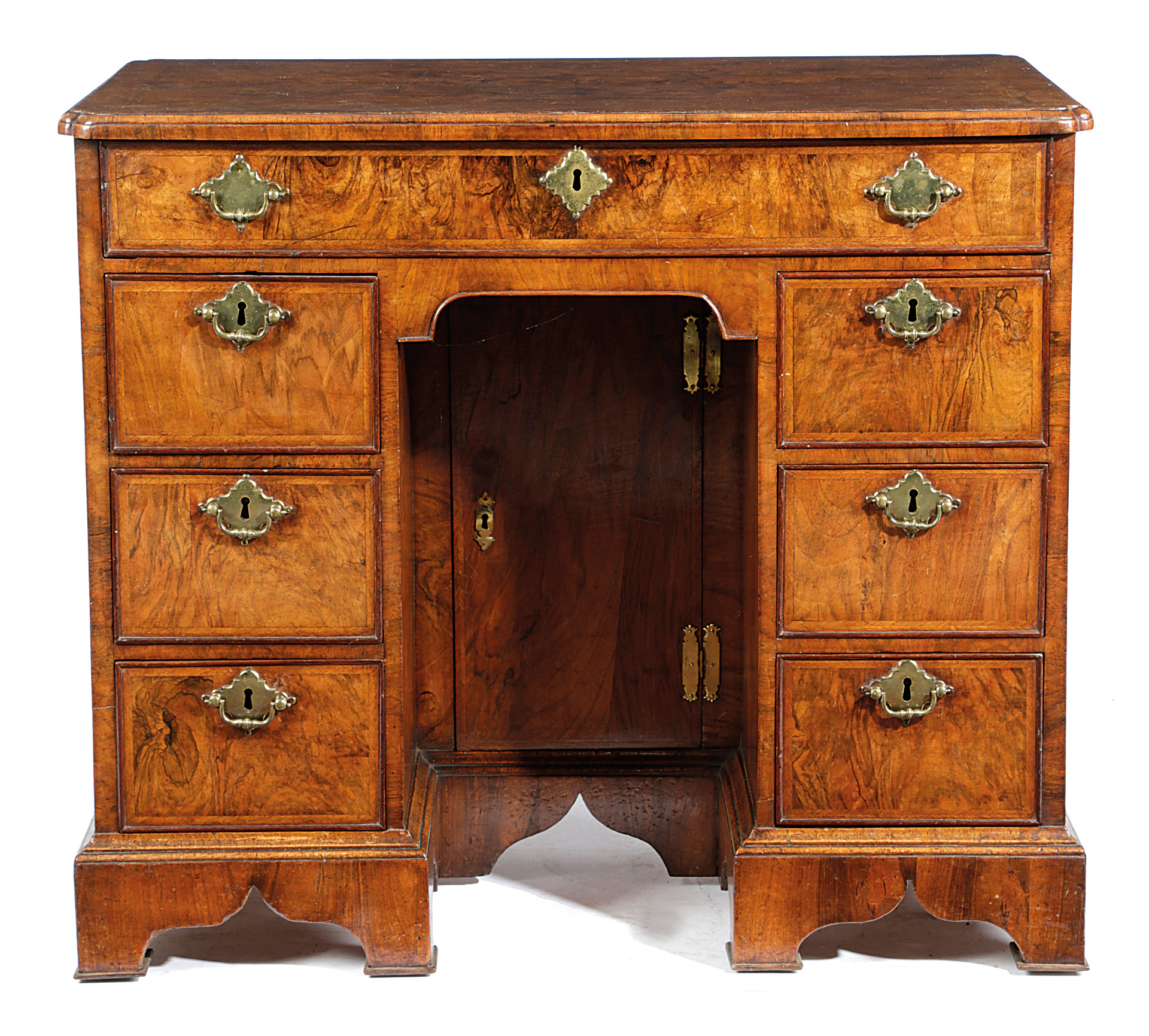 the quarter veneered top with cross and feather banding and re-entrant corners, with a caddy moulded edge above a long frieze drawer, each pedestal with three drawers, flanking a cupboard door enclosing a shelf, on arc d'arbalete bracket feet
