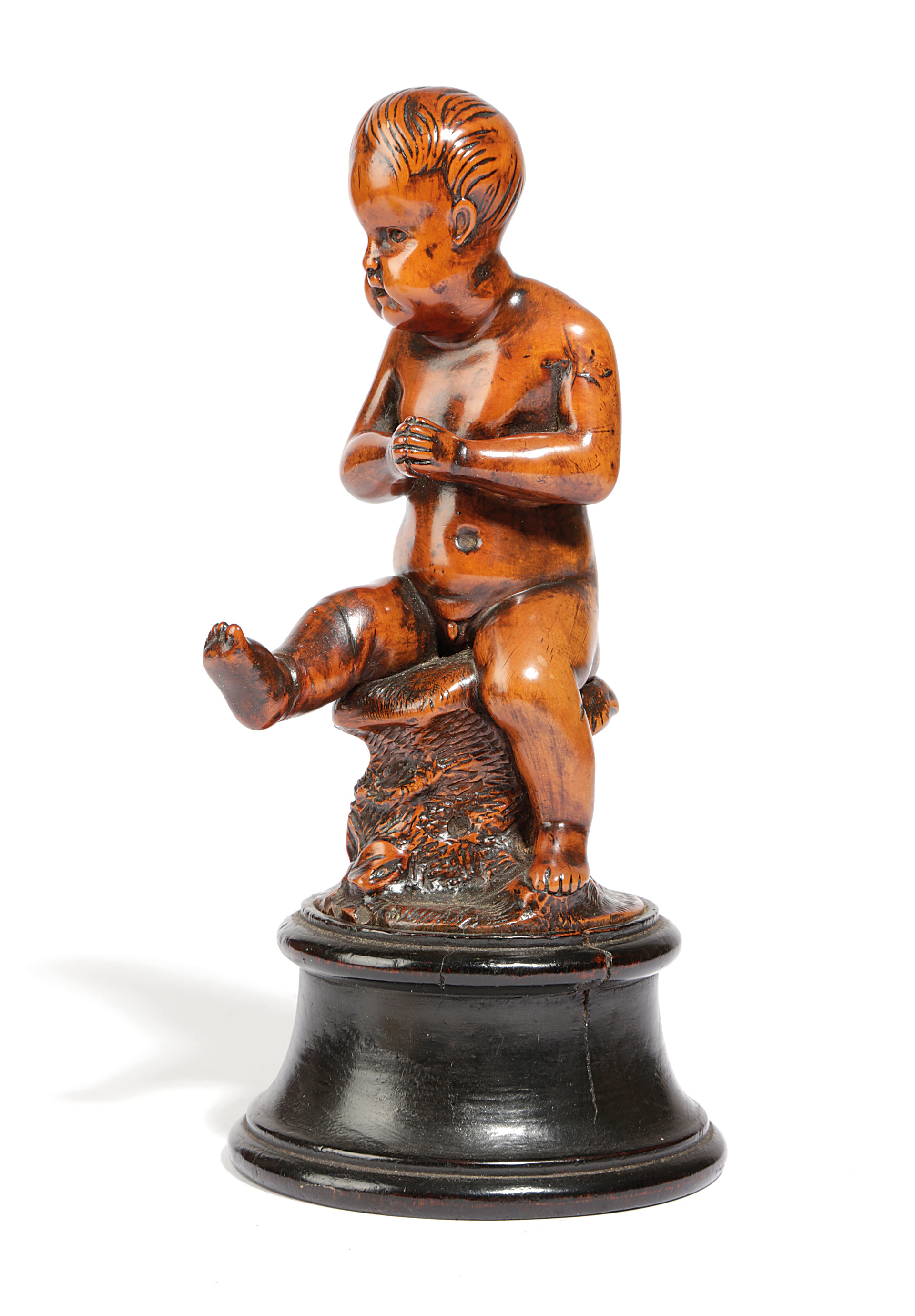 depicted seated on a a tree stump with ivy leaves, mounted on an ebonised socle