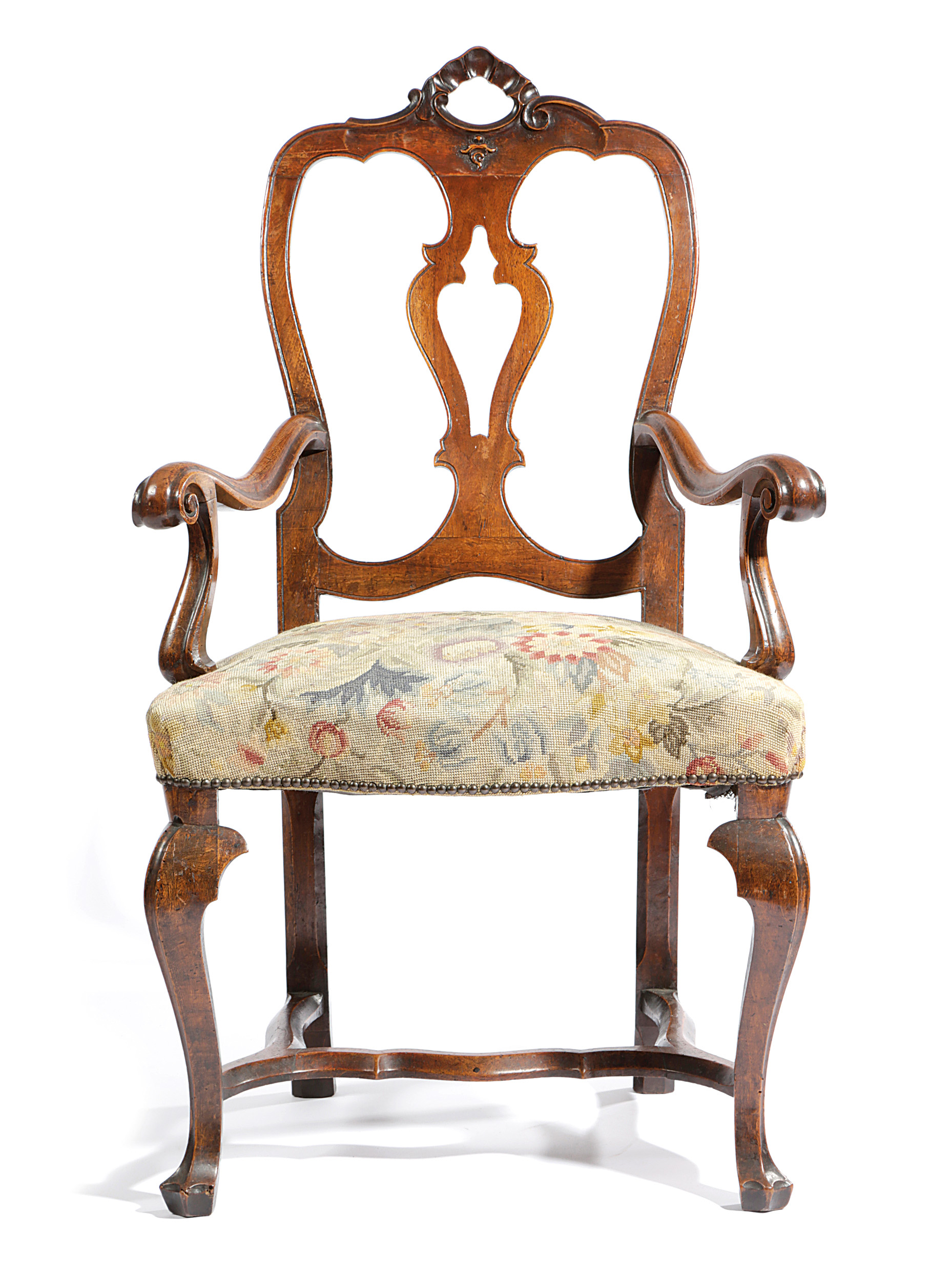 in Rococo style, with a pierced splat and a floral needlework seat, on faceted cabriole front legs united by a moulded 'H' stretcher