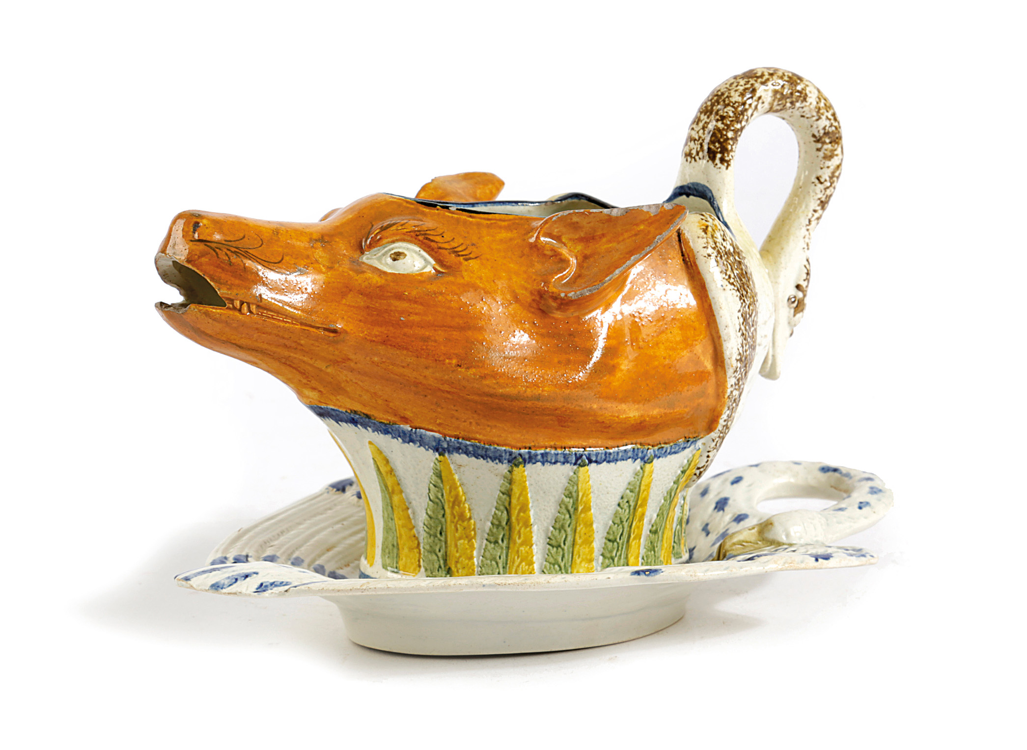A STAFFORDSHIRE PEARLWARE POTTERY FOX AND GOOSE SAUCEBOAT AND STAND