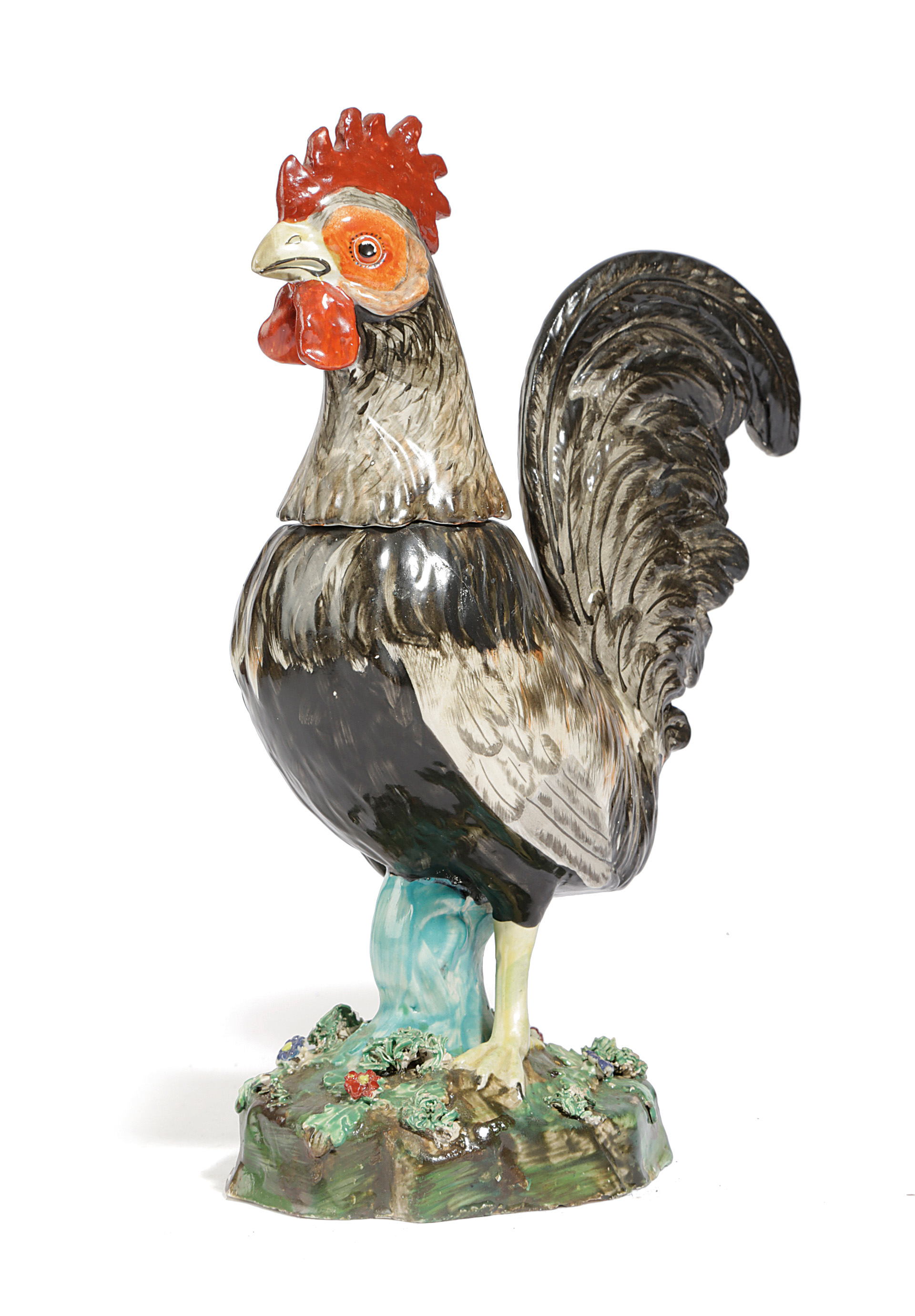 A STAFFORDSHIRE POTTERY COCKEREL JAR AND COVER
