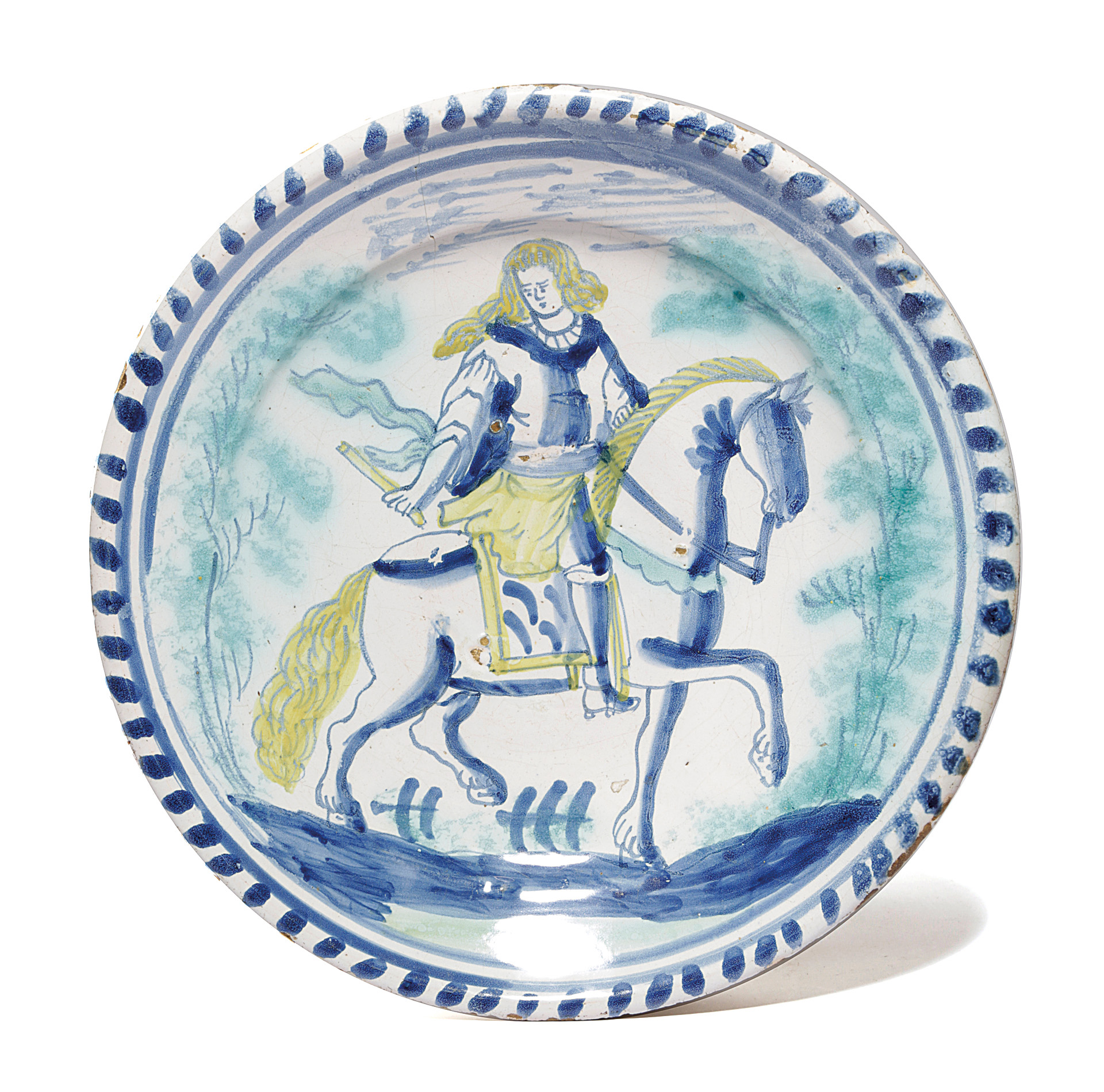 A DELFTWARE POTTERY EQUESTRIAN CHARGER