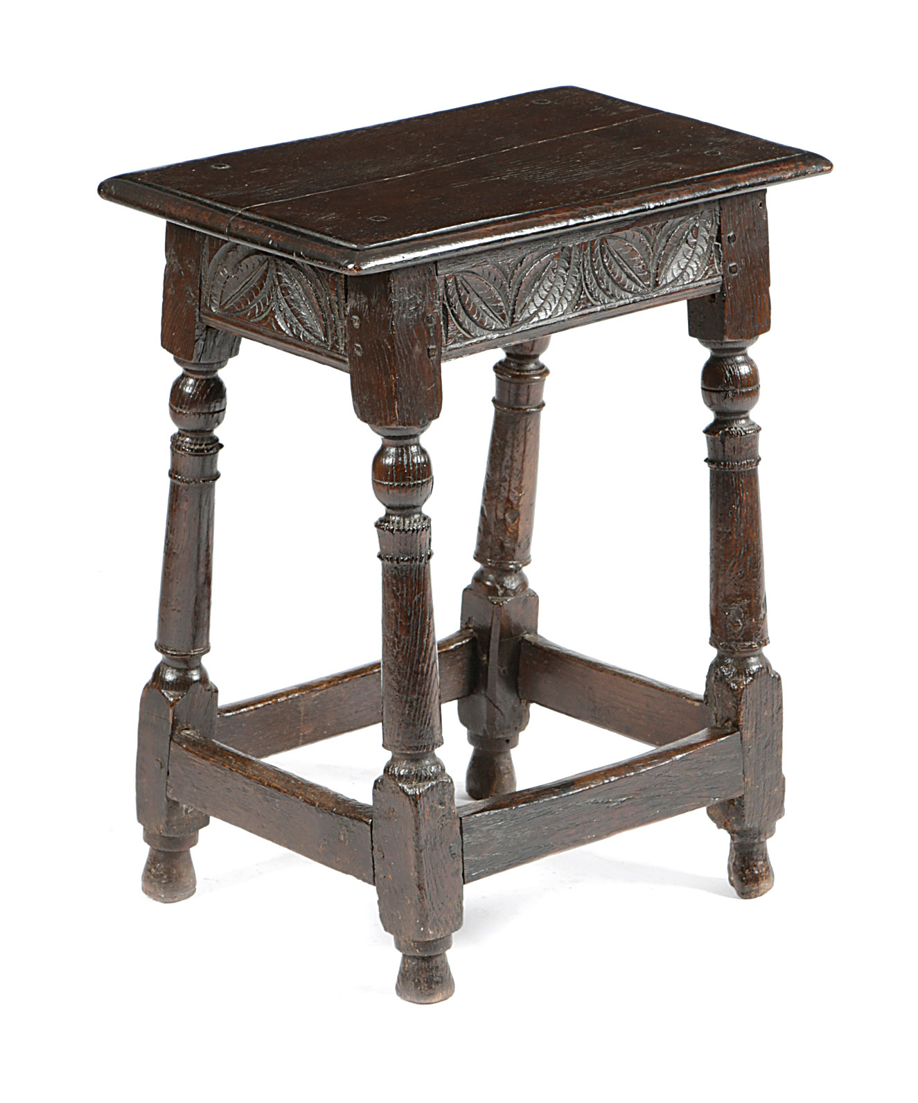 the rails carved with leaf motifs, on bobbin and baluster turned legs united by peripheral stretchers