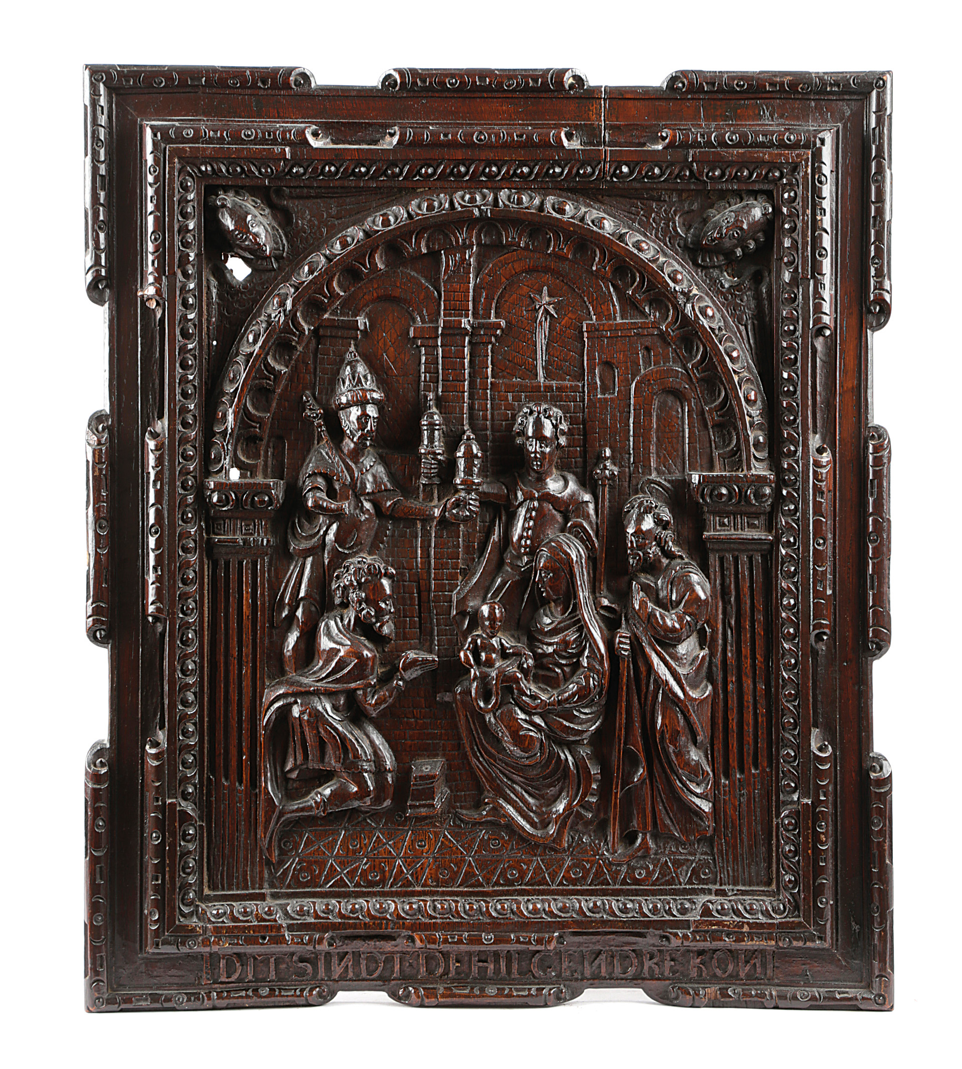 each relief carved, one depicting the Annunciation of the Virgin, the other with with the 'Nativity', each within an arch with angel mask spandrels, with inscriptions to bottom edge 'Ditsindt de Hilgendreron' and 'Ditisde Bode Schop Marie' (2)