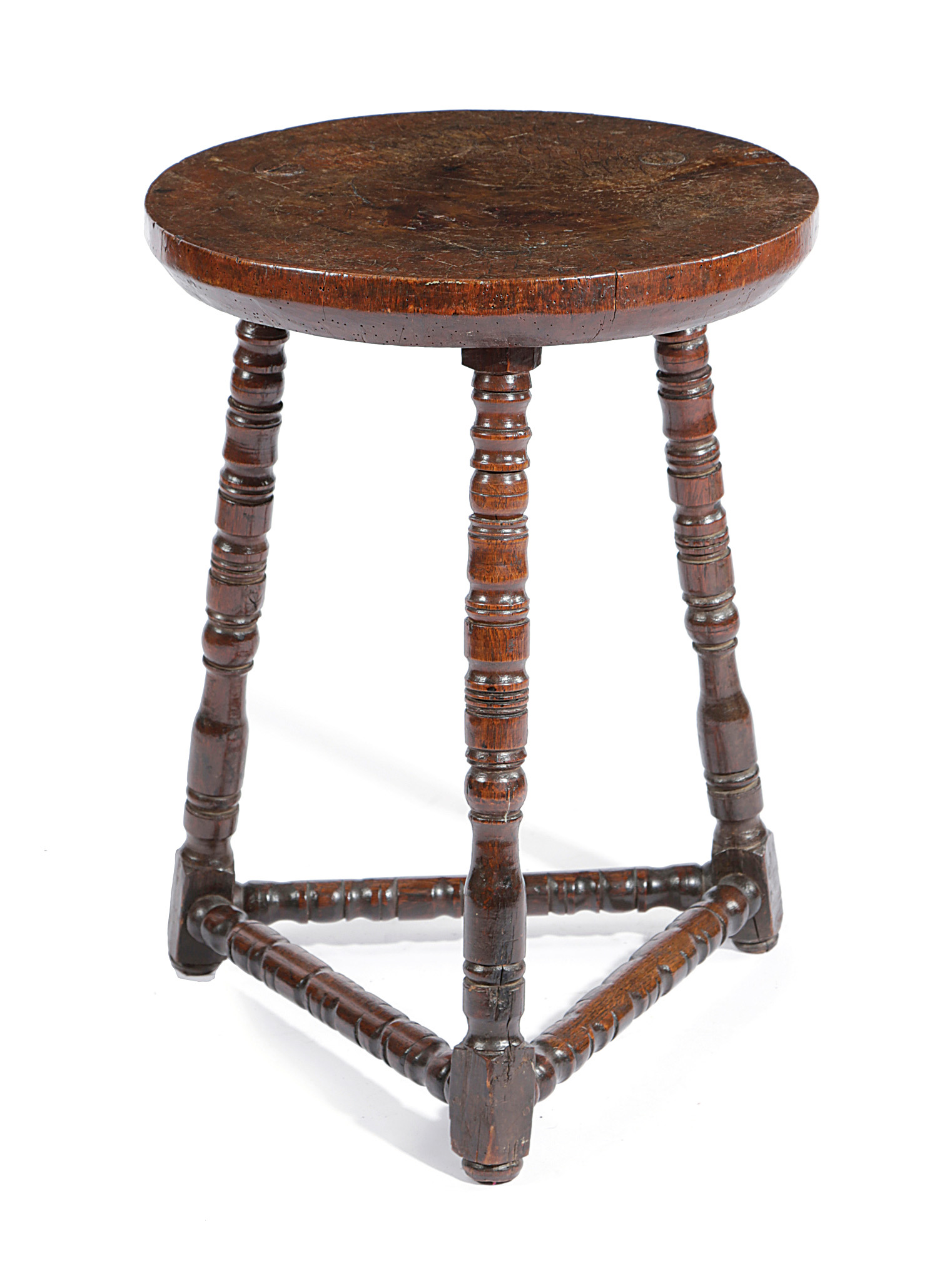 the thick burr top on turned supports united by peripheral stretchers, with traces of red painted decoration