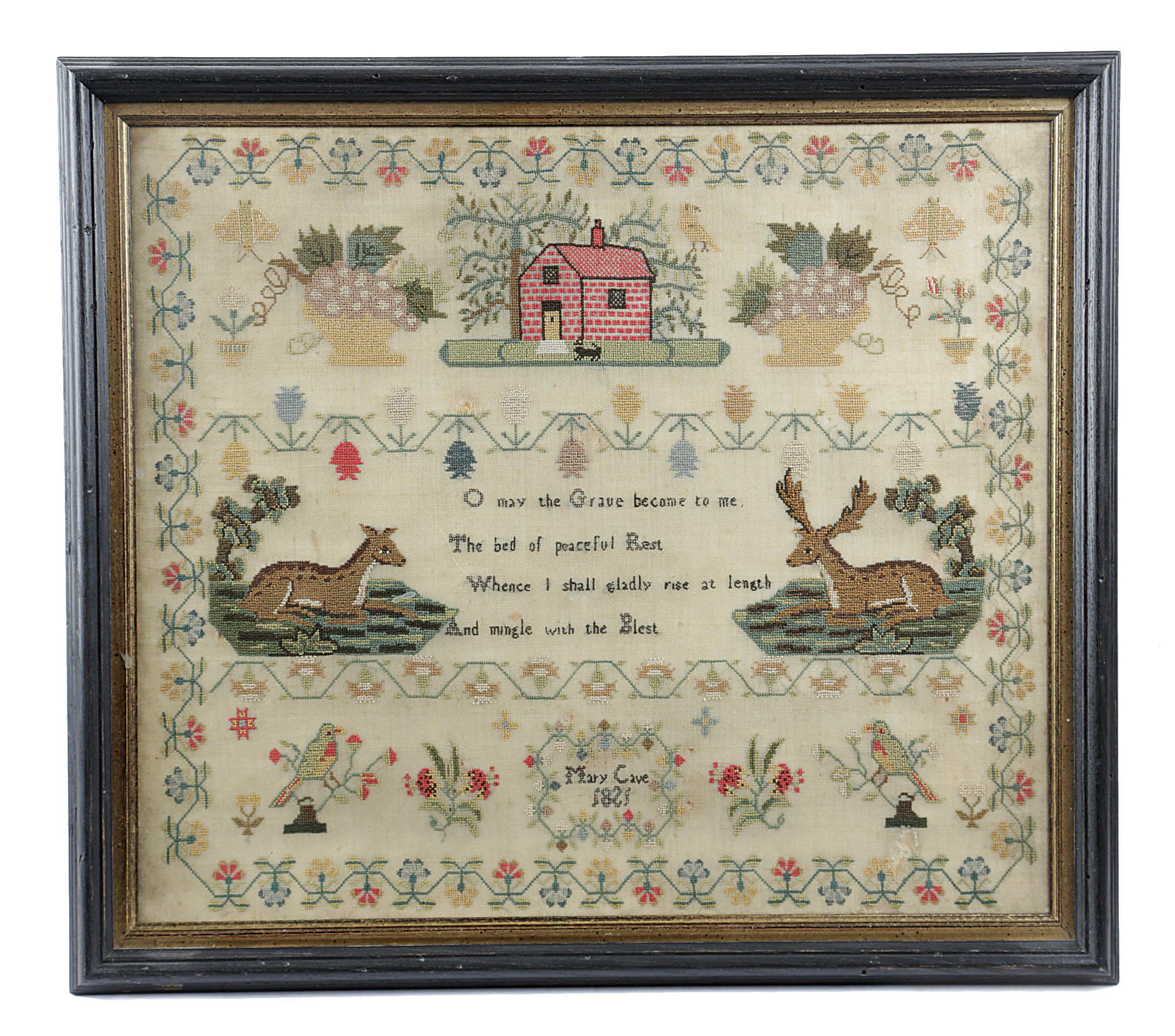 worked with polychrome silks and wools on a linen ground, with a cottage flanked by a pair of baskets of fruit, with a pair of recumbent deer flanking a pious verse, with parrots and flowers in a floral border, signed and dated 'Mary Cave 1821', in a later glazed ebonised frame