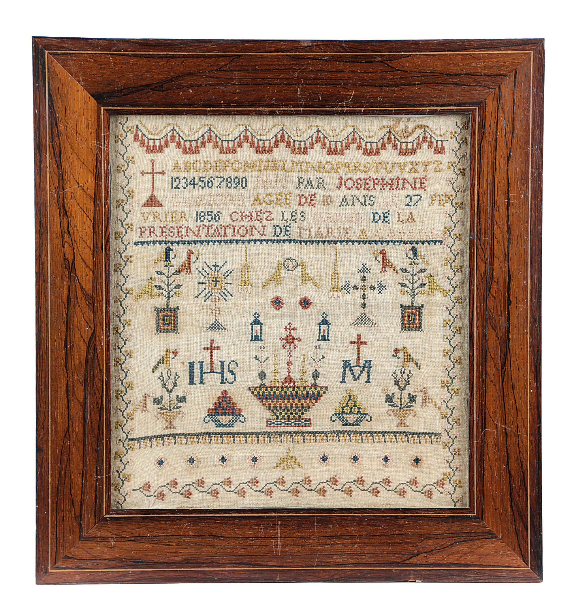 worked with coloured silks and wool on a linen ground, with an alphabet, numerals, birds, urns of flowers, bowls of fruit, an altarpiece and the Christogram 'IHS' and signed and dated 'Fait par Josephine Carigut agee de 10 ans il 27 Fevrier 1856 chez les dames de la presentation de Marie a Caranne', in a glazed rosewood frame