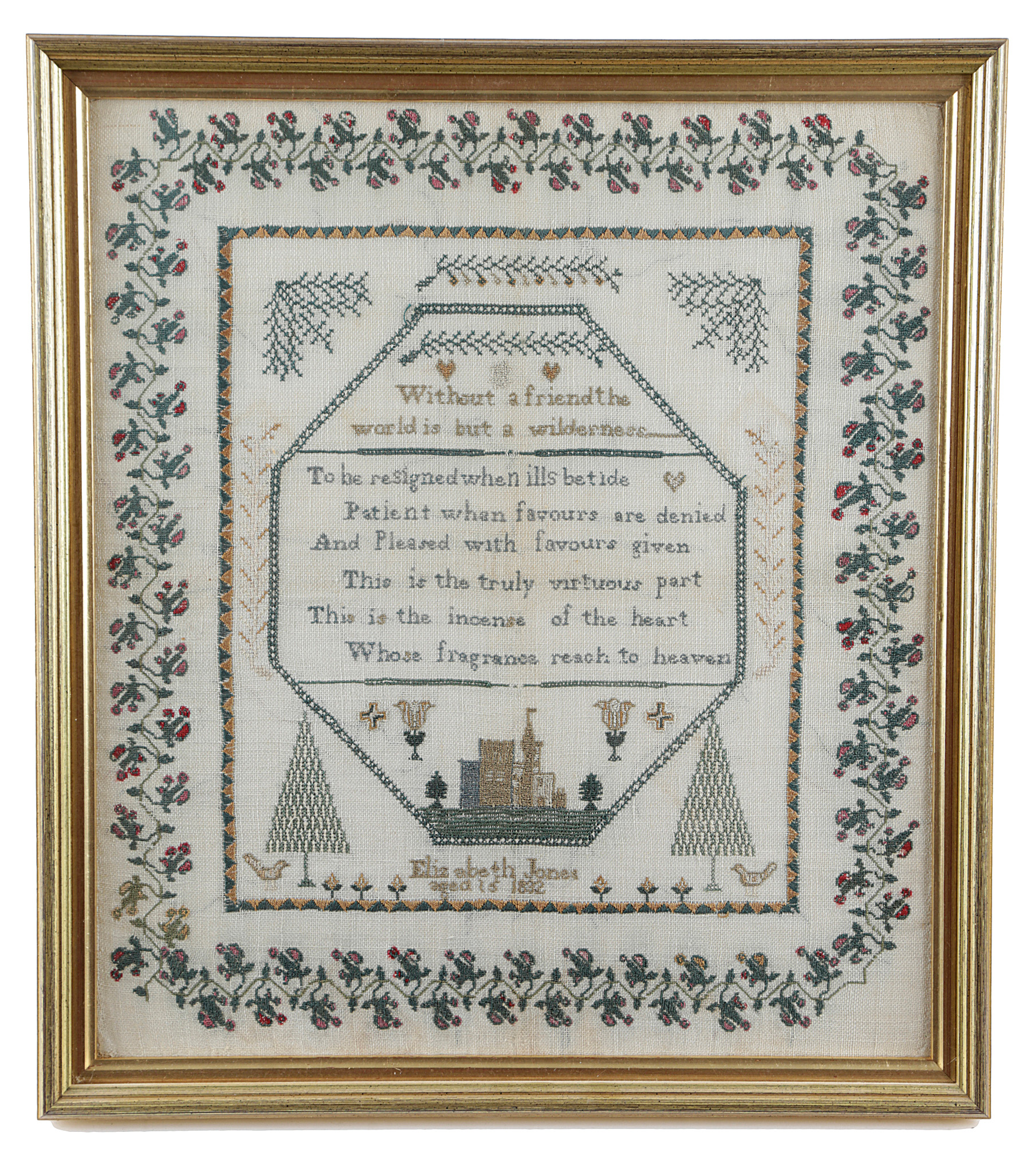 worked with coloured wools on a linen ground with a virtuous verse, with trees, birds and a castle, signed and dated 'Elizabeth Jones aged 15 1832', in a later glazed gilt frame