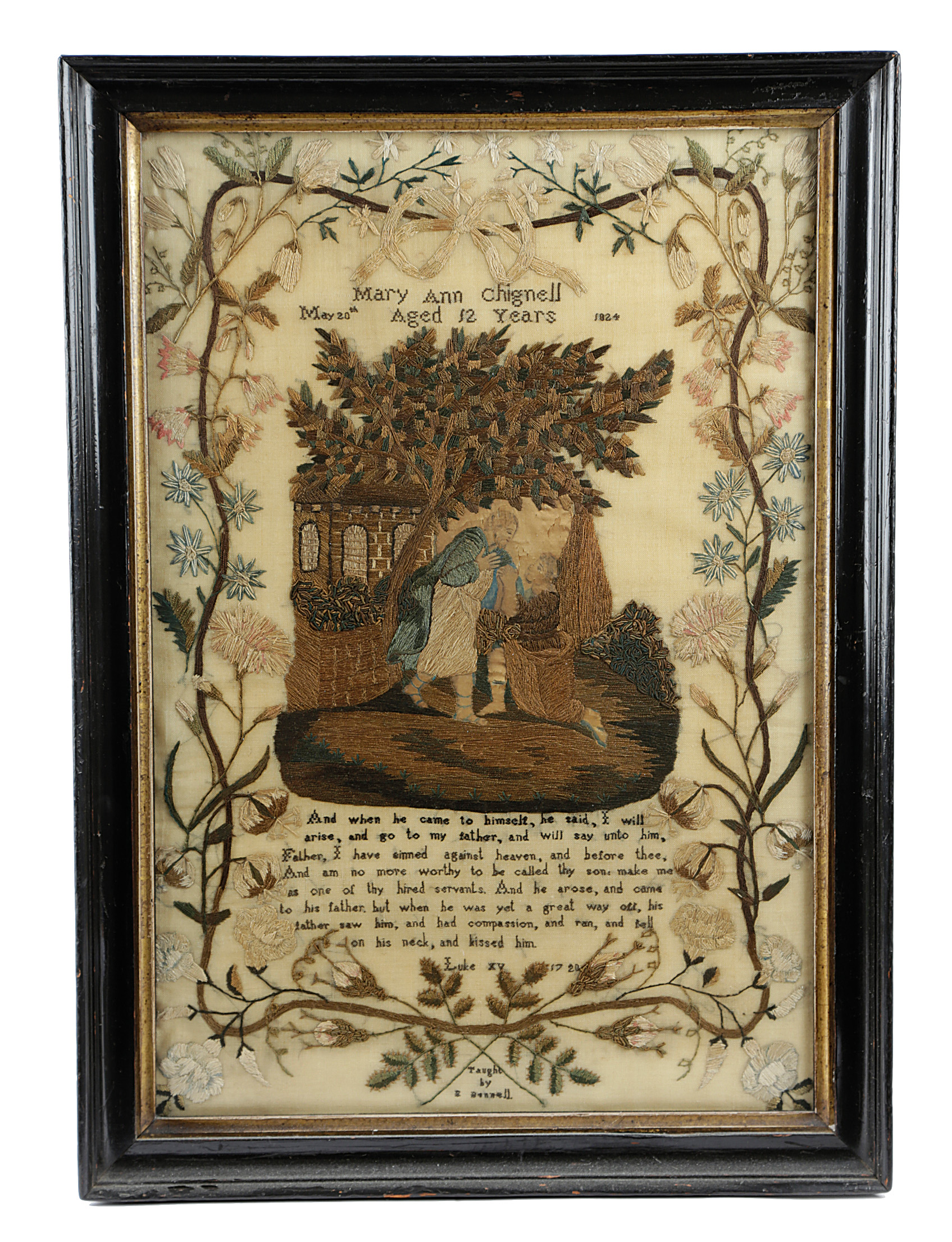 worked with coloured silks and chenille on a fine ground, in various stitches, including: satin, straight and split stitch with bullion knots, with a central scene depicting the return of the prodigal son, with painted silk features above an extract from Luke XV 1720, with a free-hand ribbon tied floral border, signed and dated 'Mary Ann Chignell May 20th Aged 12 Years 1824' and 'Taught by E. Bennell', in a glazed ebonised frame