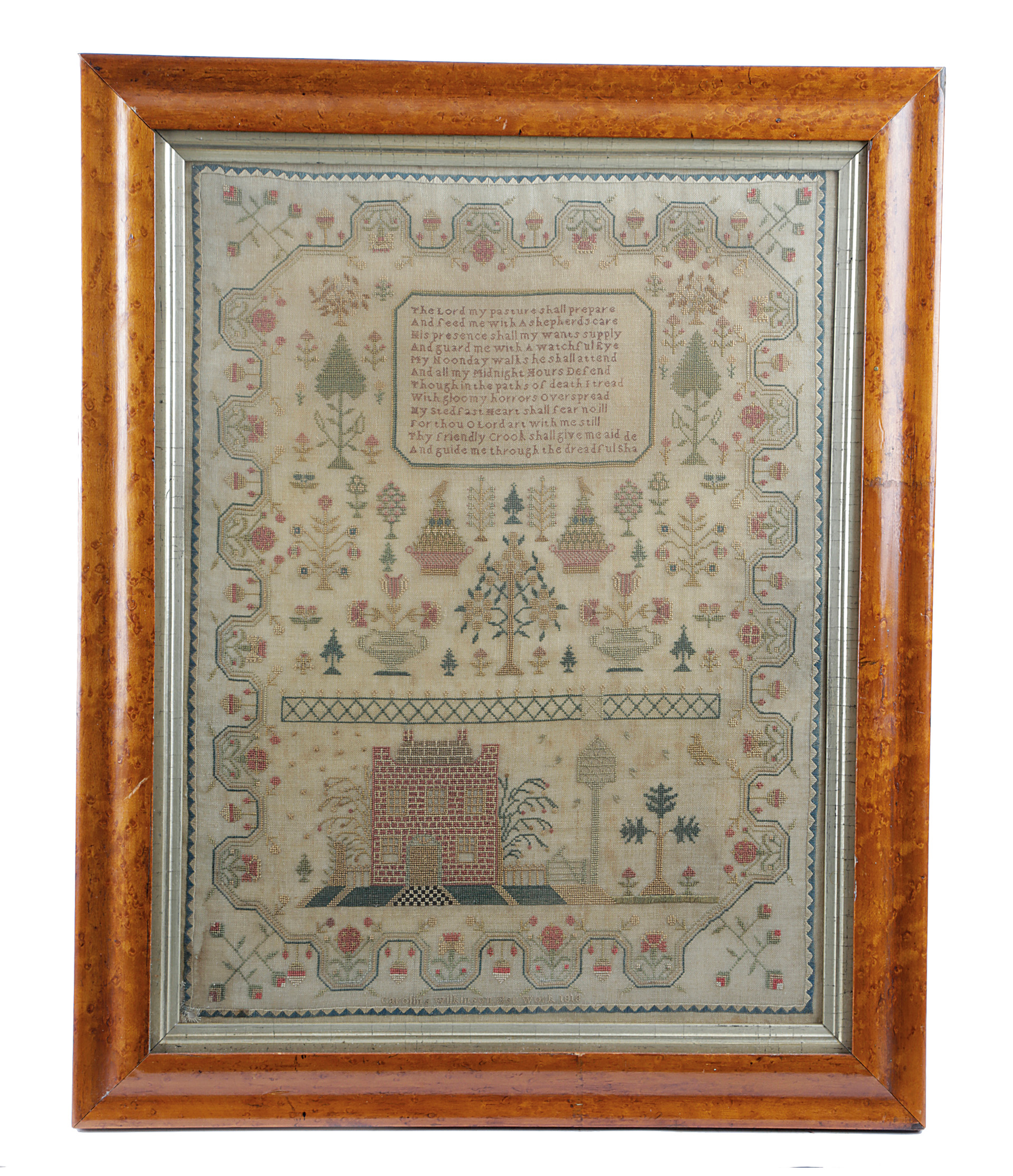 worked with coloured silks on a fine linen ground, in cross stitch, with a virtuous verse above baskets of flowers, urns of flowers and birds, with a Georgian red-brick house with a dovecote, signed and dated 'Caroline Wilkinson Her Work 1818', in a glazed bird's eye maple frame