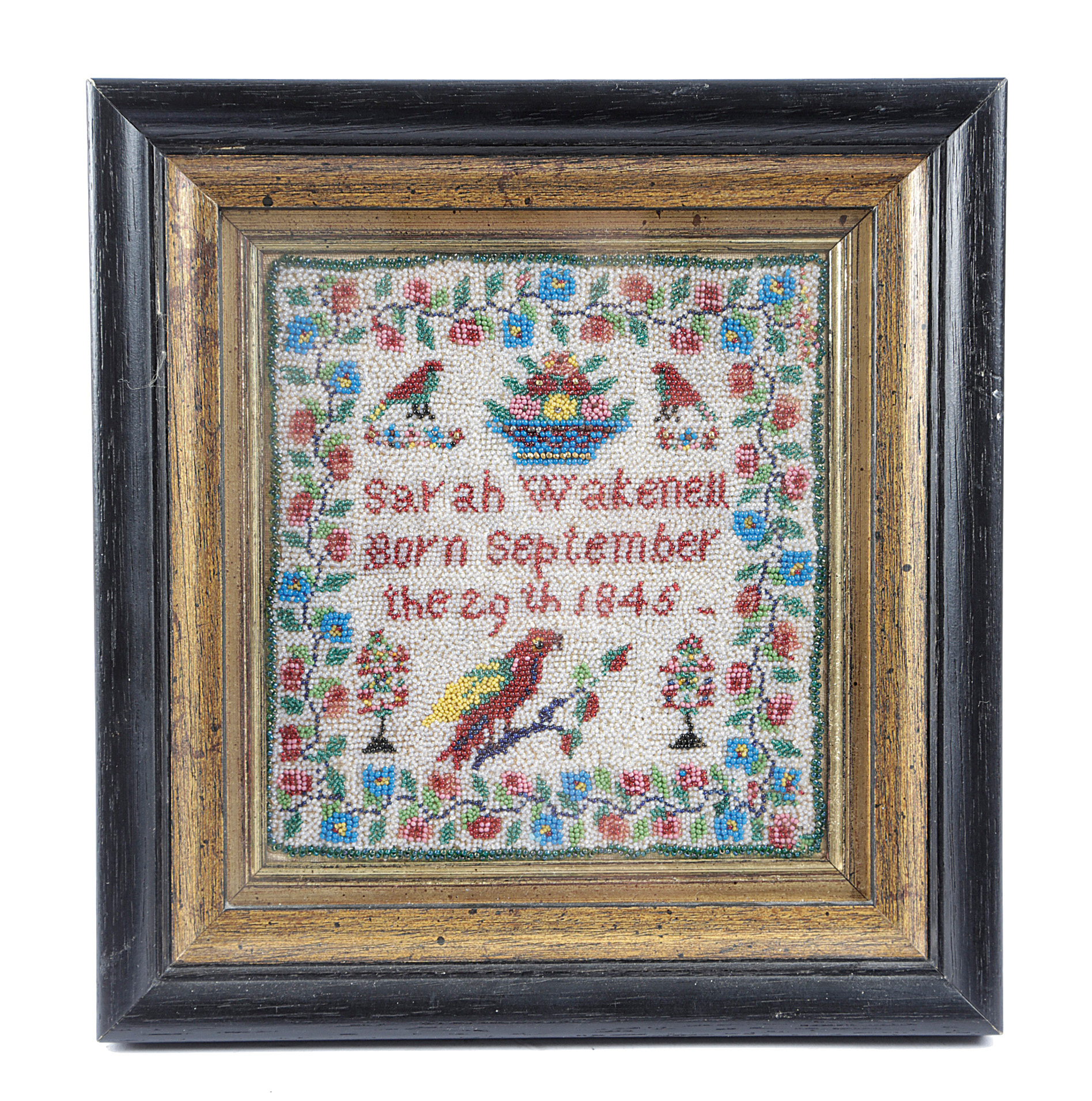 worked with colourful beads on a linen ground, with a flower border of roses and forget-me-nots, decorated with two birds above a crown, flanking a colourful urn of flowers and a parrot on a branch flanked by trees, the centre with the inscription 'Sarah Wakenell born September the 29th 1845 -', in an ebonised and gilt frame, together with a small needlework picture, worked with polychrome silks on a gauze ground, with cross and satin stitch, with a zigzag border, decorated with flowers, butterflies and birds around a tree motif, the centre with a verse, in a glazed wood frame (2)