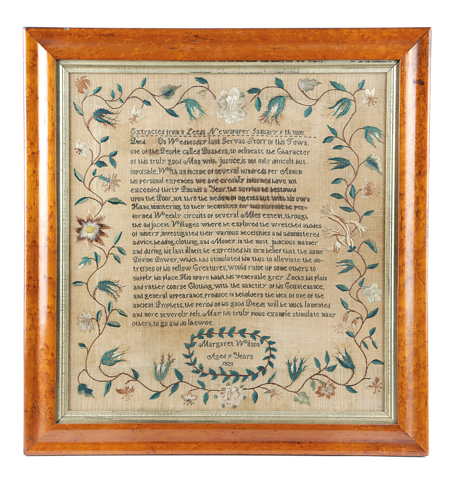 worked on a linen ground, with the obituary of a Quaker, called George Storr, taken from a Leeds newspaper (The Leeds Mercury), within a freehand floral border embroidered with coloured silks, with lily, dog rose and other flowers, signed and dated 'Margaret Wilson Aged 9 years 1828', in a glazed bird's eye maple frame
