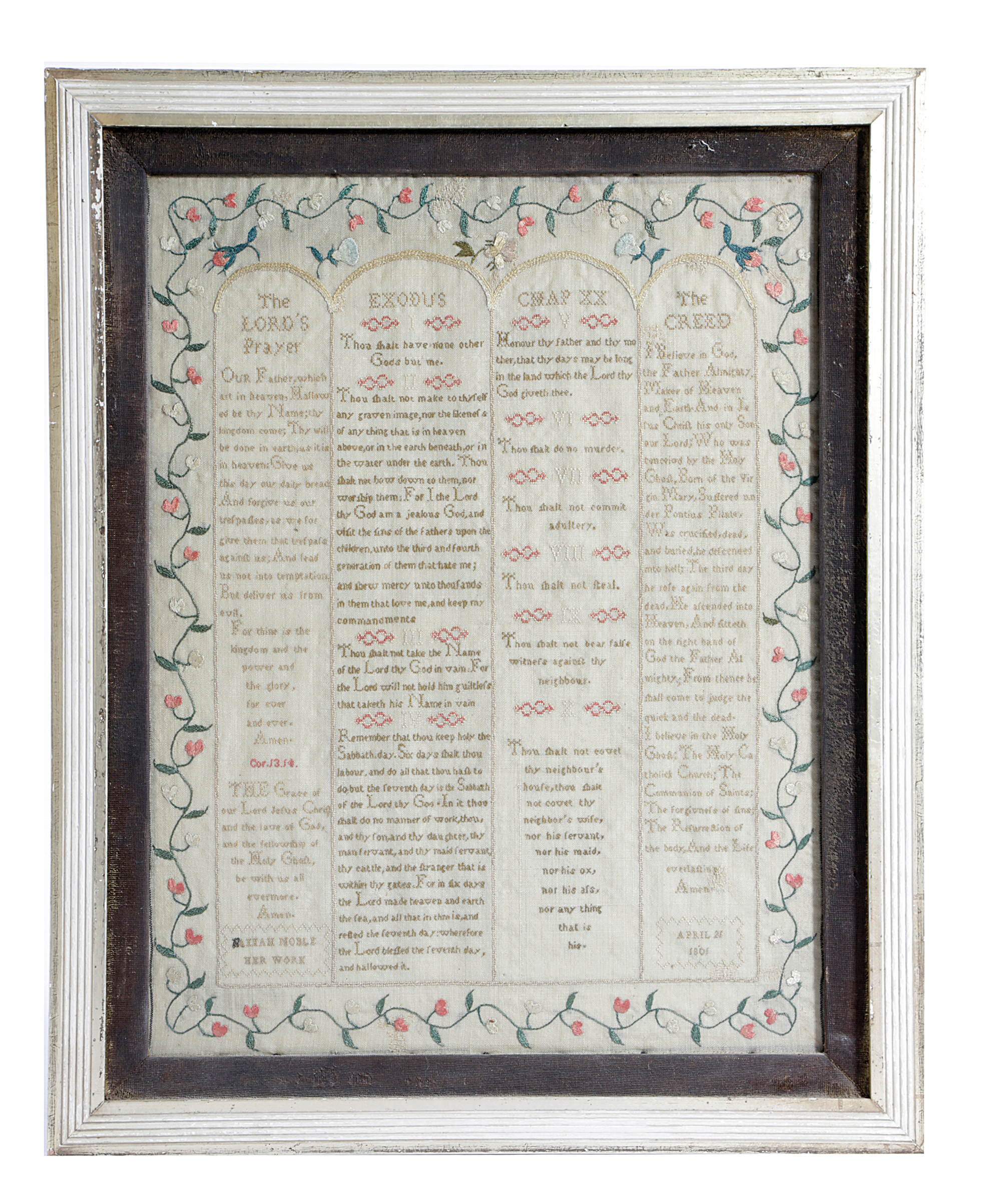 worked with polychrome silks on a canvas ground, with cross and satin stitch, the larger relates to the first day of the Easter Triduum, with four tablets worked with the Lord's Prayer, Exodus Chapter XX and The Creed, the smaller decorated with crowns above temple columns and 'On Good Friday', both signed 'Hannah Noble' and dated '18010 and '1803', in later glazed frames (2)