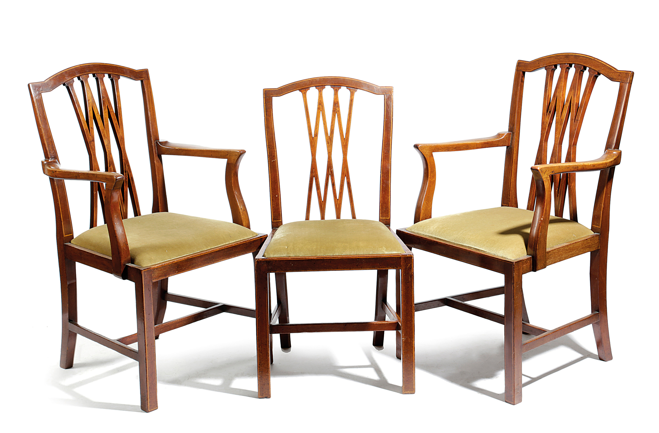 inlaid with boxwood stringing, each with an arched lattice pierced splat back above a drop-in seat, on chamfered front legs united by an 'H' stretcher, comprising: a pair of open armchairs and ten side chairs (12)