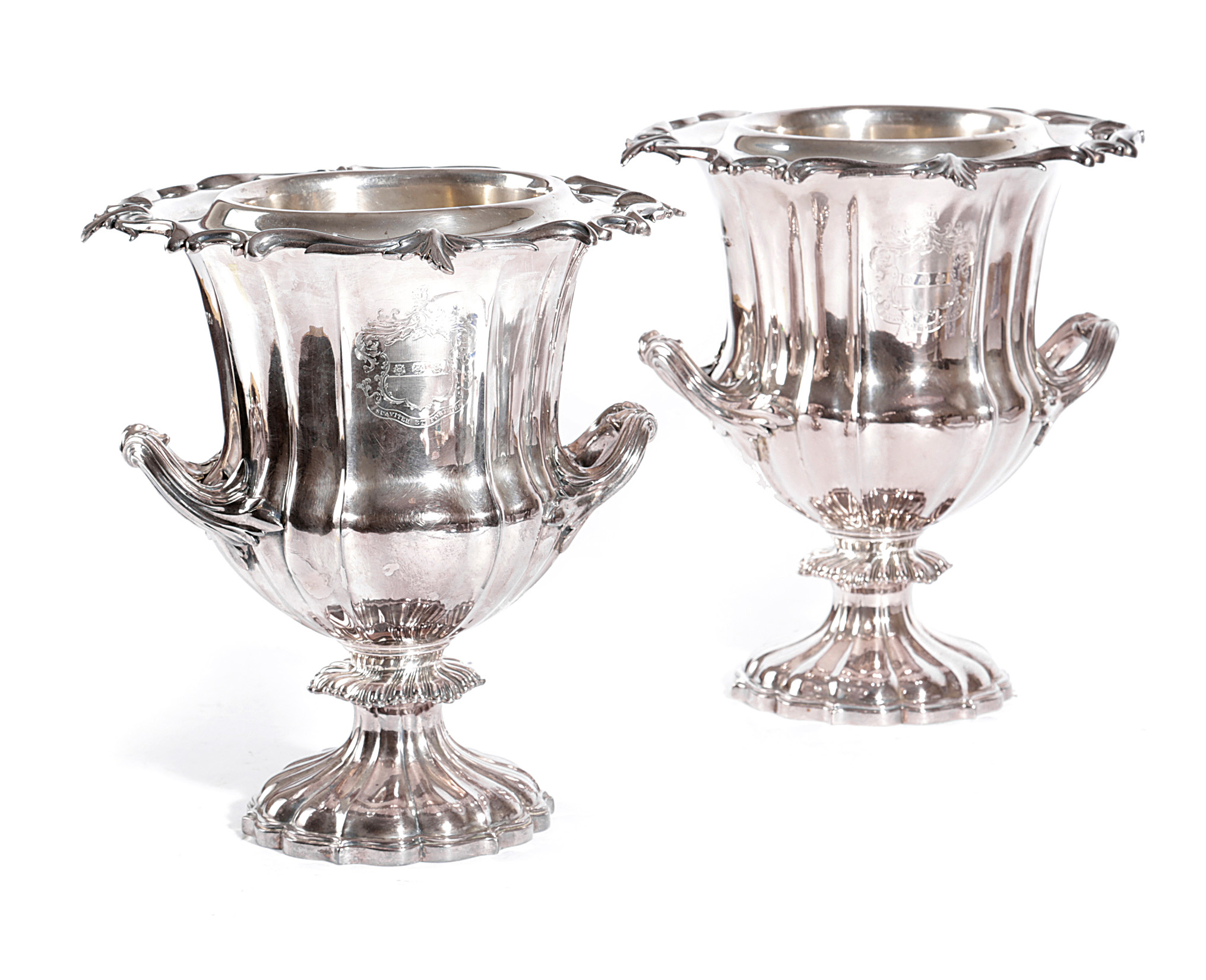 A PAIR OF WILLIAM IV SILVER TWO-HANDLED WINE COOLERS