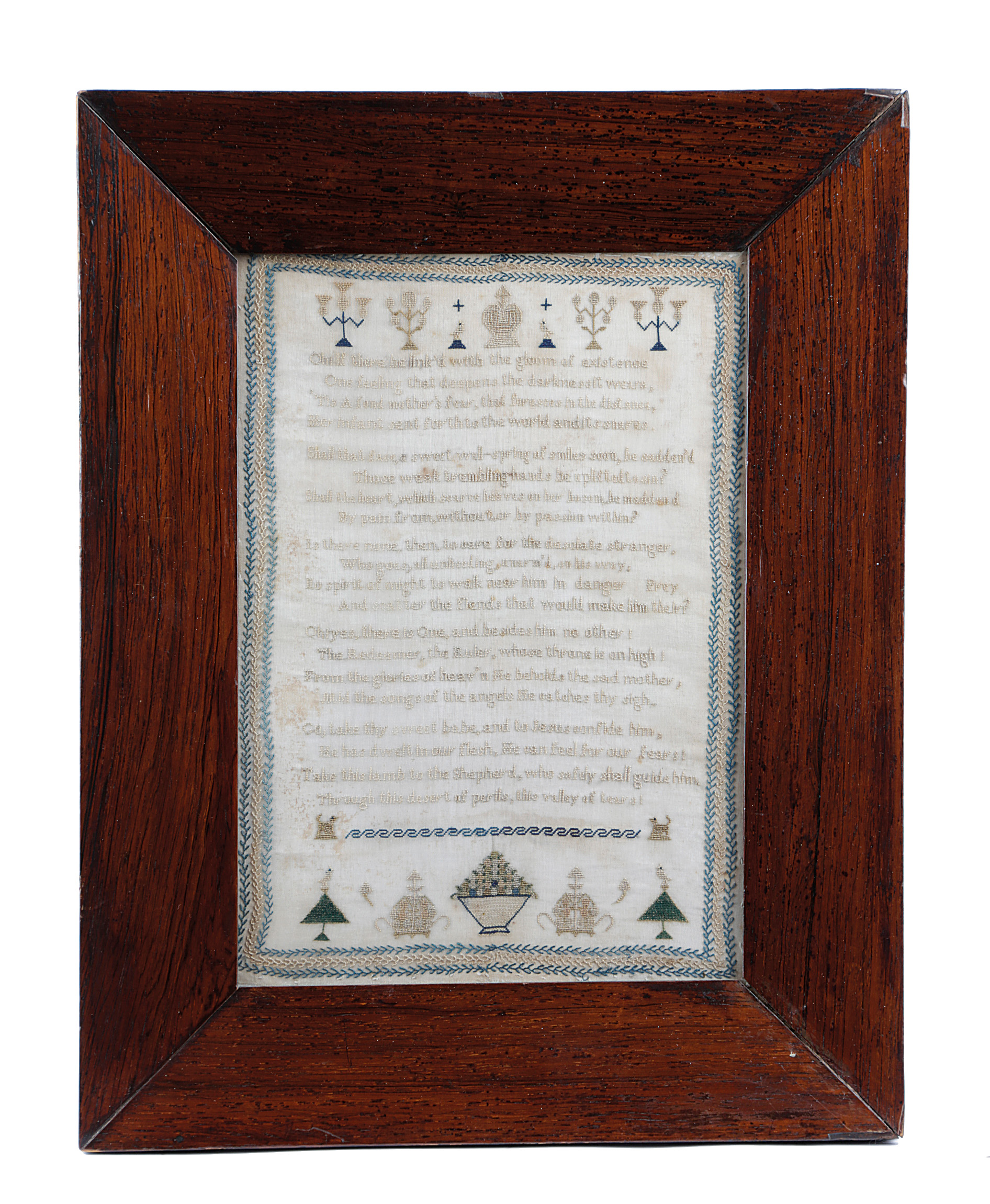 worked with gold, green and blue silk on a fine linen ground, in cross stitch, with candelabra, an urn, a basket of fruit, dogs and trees with birds and a psalm, in a glazed rosewood frame