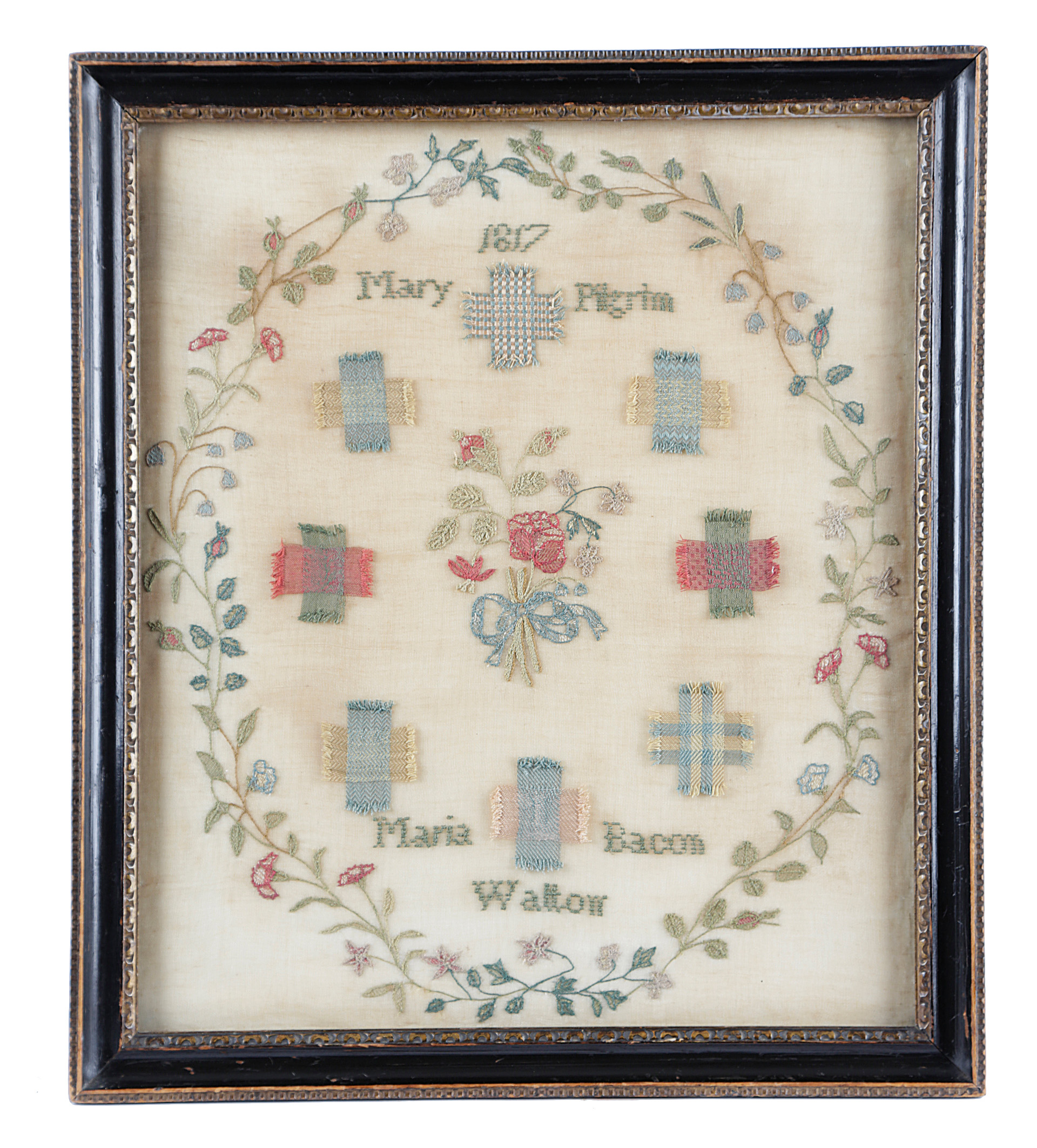 finely worked on a fine gauze ground, with a freehand floral garland with pattern darn details, enclosing eight hand-woven darns, each of a different pattern, signed and dated '1817 Mary Pilgrim Maria Bacon Waton', in a later glazed gilt and ebonised frame
