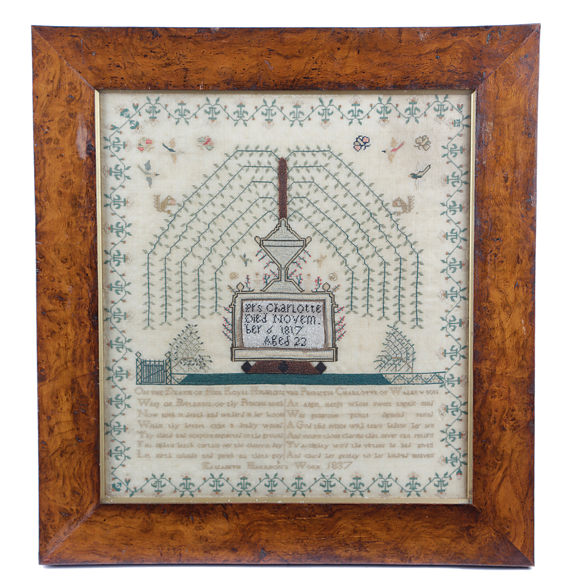 worked with polychrome silks and beads on a linen ground, commemorating the death of Queen Charlotte, with a sarcophagus, inscribed 'Mrs Charlotte Died November 6 1817 Aged 22', with an urn issuing leaves, with a pair of weeping willow trees, birds and squirrels, inscribed 'On The Death of Her Royal Highness The Princess Charlotte of Wales', signed and dated 'Elizabeth Harrison's Work 1837', in a glazed burr oak frame