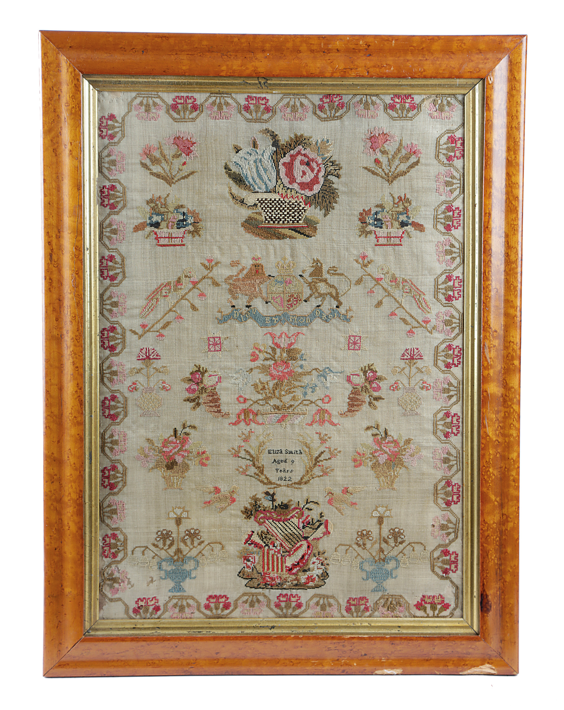 worked with coloured silks and wool on an undyed linen ground, with cross and satin stitches, with baskets of roses and tulips, urns and a cornucopia of flowers, with the Royal Coat of Arms, the base with a display of musical instruments, in a gillyflower border, signed and dated 'Eliza Smith Aged 9 Years 1822', in a glazed bird's eye maple frame