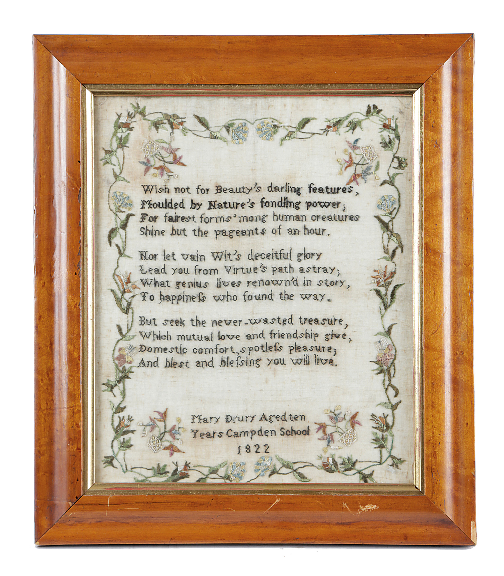 worked with coloured silks on a linen ground, with a virtuous text within a freehand meandering flower border, signed and dated 'Mary Drury aged ten years Campden School 1822', in a later glazed bird's eye maple frame