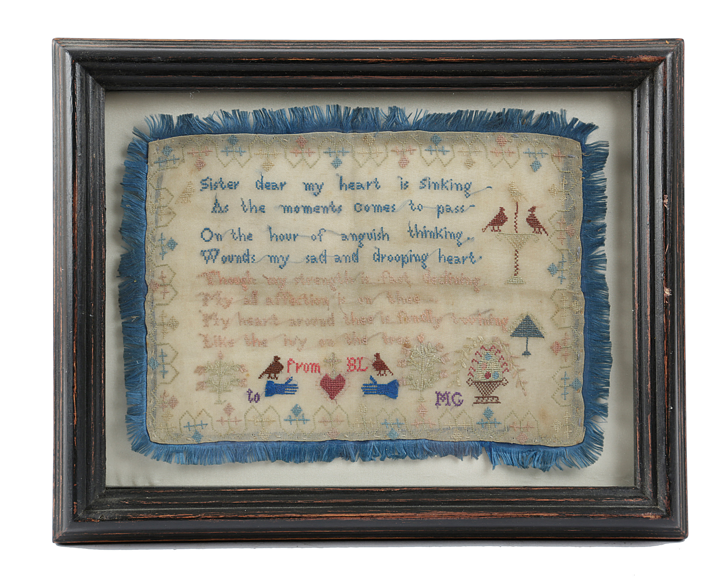 worked with polychrome silk floss on an organza ground, mainly in cross stitch, with a farewell message as a verse, above flowering trees, birds, two gauntlets and a heart with a cross, with the inscription 'from BL to MG', in a zigzag, cross and diamond border, with a deliberately frayed ribbon edge, in a later glazed ebonised frame