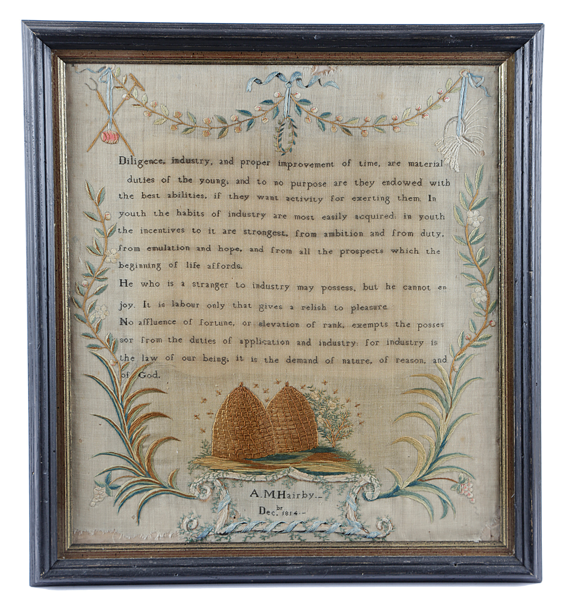 worked with coloured silks on a linen ground, with an extract from Hugh Blair's 'The Classic; Or, Summary of Mental Improvement and Moral Entertainment', above a pair of beehives and a raised work basket cartouche, signed and dated 'A. M. Hairby Dec.br 1814' with a freehand leaf and floral border, the top with ribbon tied swags of laurel and with farm tools, in a later glazed ebonised frame