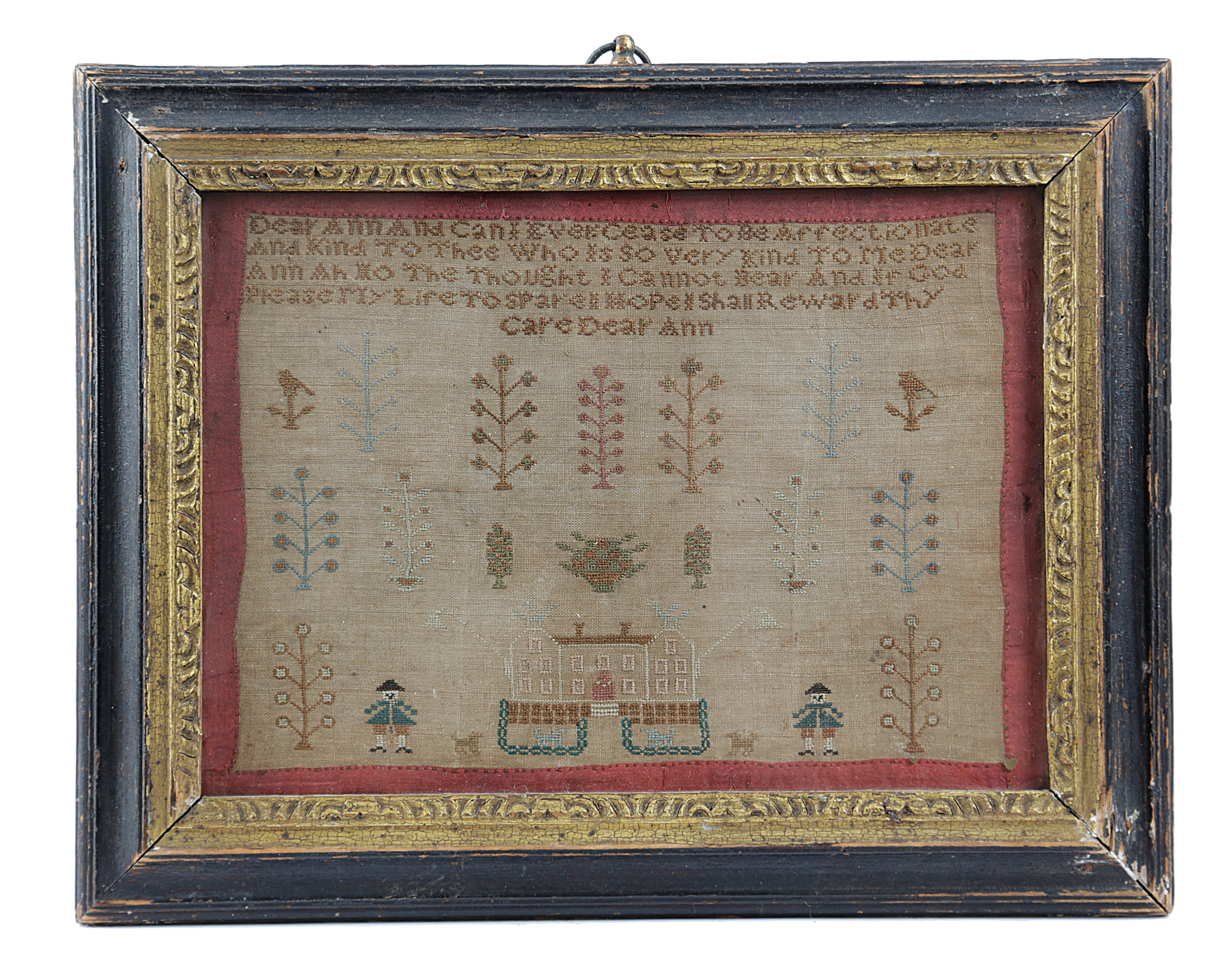 worked with polychrome silks with cross stitch on a canvas ground, with two verses from Ann Taylor's poem 'My Mother', the word mother replaced with 'Dear Ann', above birds and stylised flowers with a central urn, below two figures and their dogs flanking a building, with a pink ribbon edge, in a glazed ebonised and gilt frame