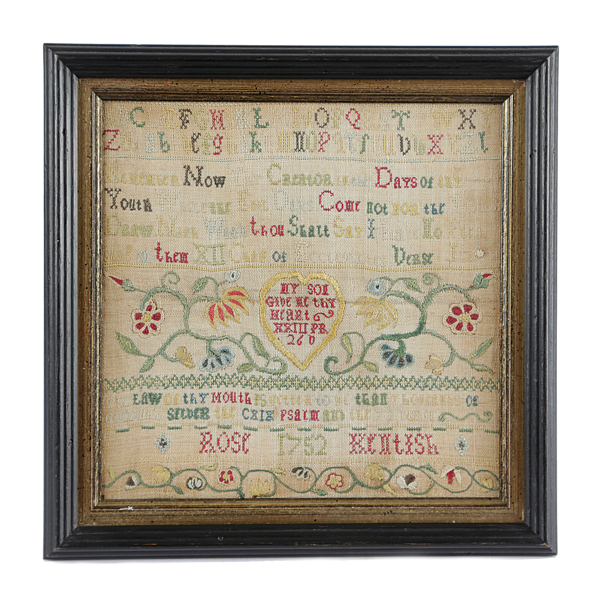 worked with coloured silks in various stitches, including: satin, chain, cross and buttonhole, on a tammy ground, with alphabets, text from the 12th chapter of Ecclesiastes and with scrolling leaves and flowers flanking a heart framing words from Proverbs 23, verse 6, and text from the 72nd verse of Psalm 119, signed and dated 'Rose Kentish 1752', in a later glazed gilt and ebonised frame