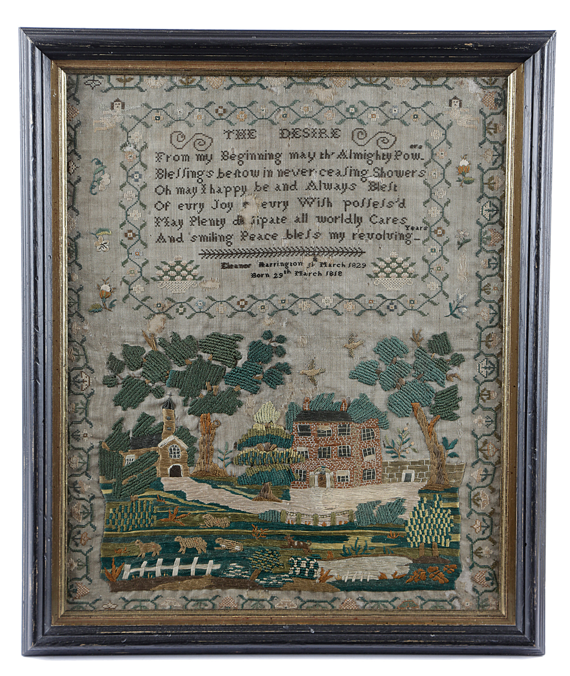 worked with coloured silks on a linen ground, in various stitches, including: cross, long, short, buttonhole bar and satin stitch, with a verse titled 'The Desire' from Thomas Dilworth's 'A New Guide to the English Tongue', above a scene with a house and a church, with trees, birds, sheep and a pond, signed and dated 'Eleanor Barrington ..March 1829, Born 29th March 1818', in a later glazed ebonised frame
