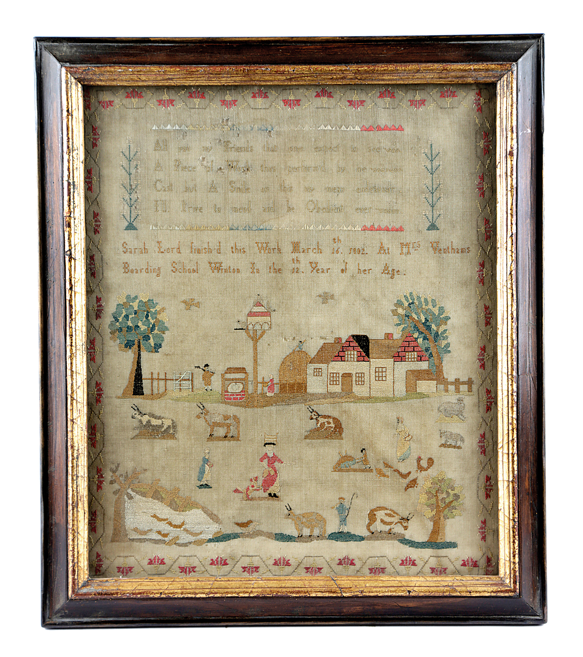 worked with coloured silks, with cross stitch and peitit point on a fine linen ground, with a farmyard scene with buildings, a dovecote, figures, animals and a pond, with a virtuous verse and signed and dated 'Sarah Lord finished this Work March 16th 1802. At Mrs Venthams Boarding School Winton In the 12th Year of her Age', with a zigzag carnation border, in a later glazed frame