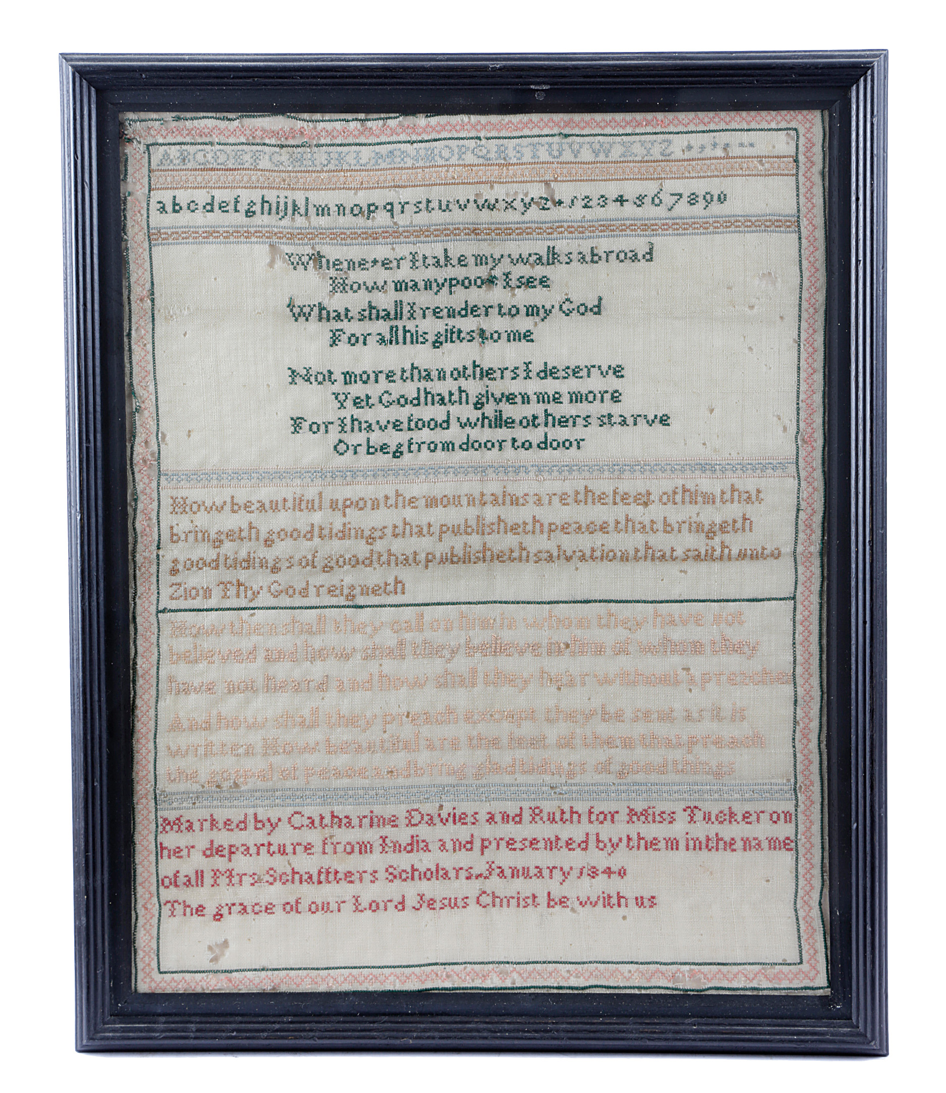worked with polychrome silks on a linen ground, in cross stitch, with alphabets and three verses, inscribed 'Marked by Catherine Davies ad Ruth for Miss tucker on her departure from India and presented by them in the name of all Mrs Schaffters Scholars. January 1840', in a later glazed ebonised frame