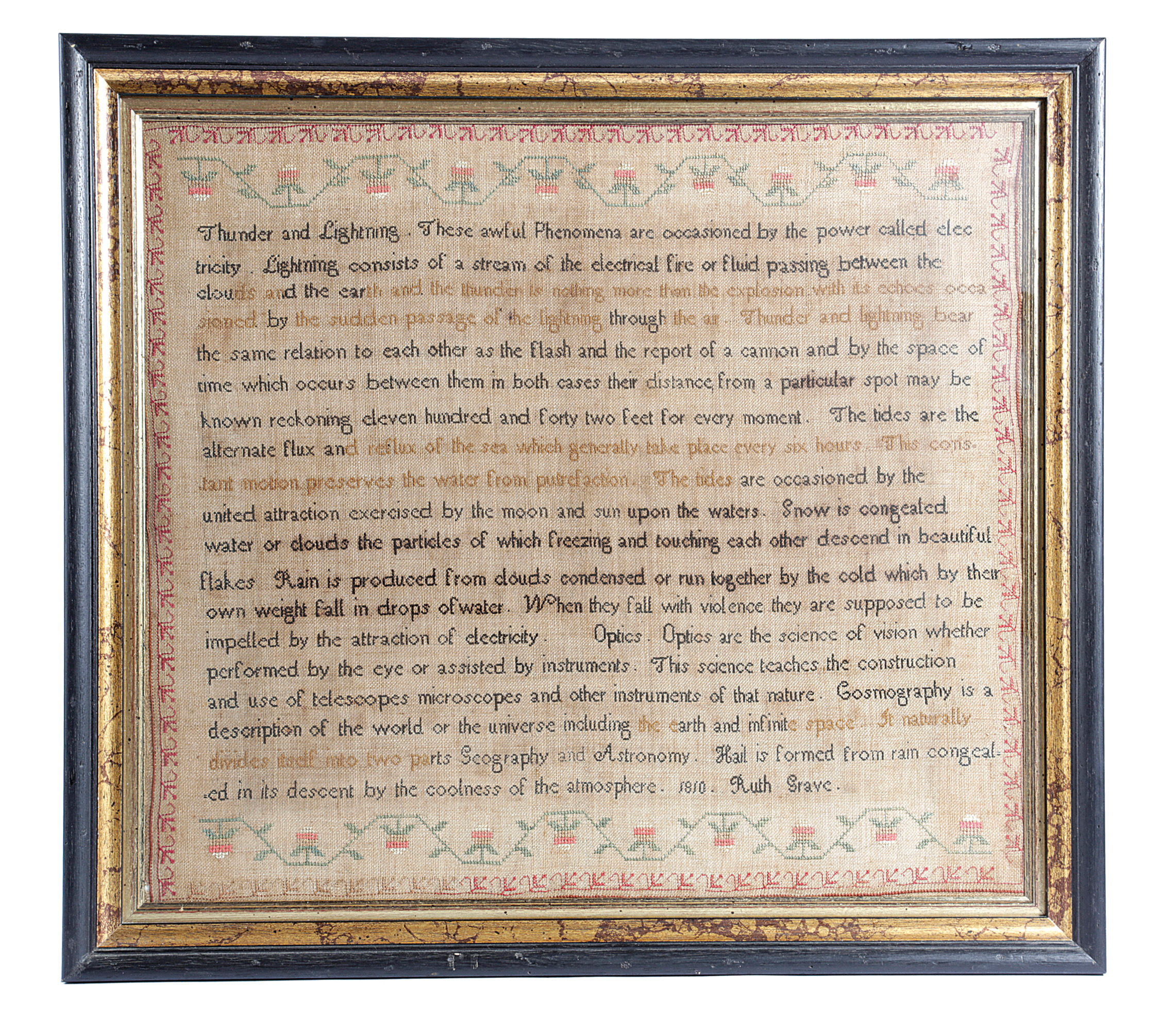 worked in cross stitch on a linen ground, with text describing descriptions and explanations of natural phenomena found in the 'English Spelling-Book' edited by William Mavor, Vicar of Hurley in Berkshire, signed and dated 'Ruth Grave 1810', in a later glazed gilt and ebonised frame