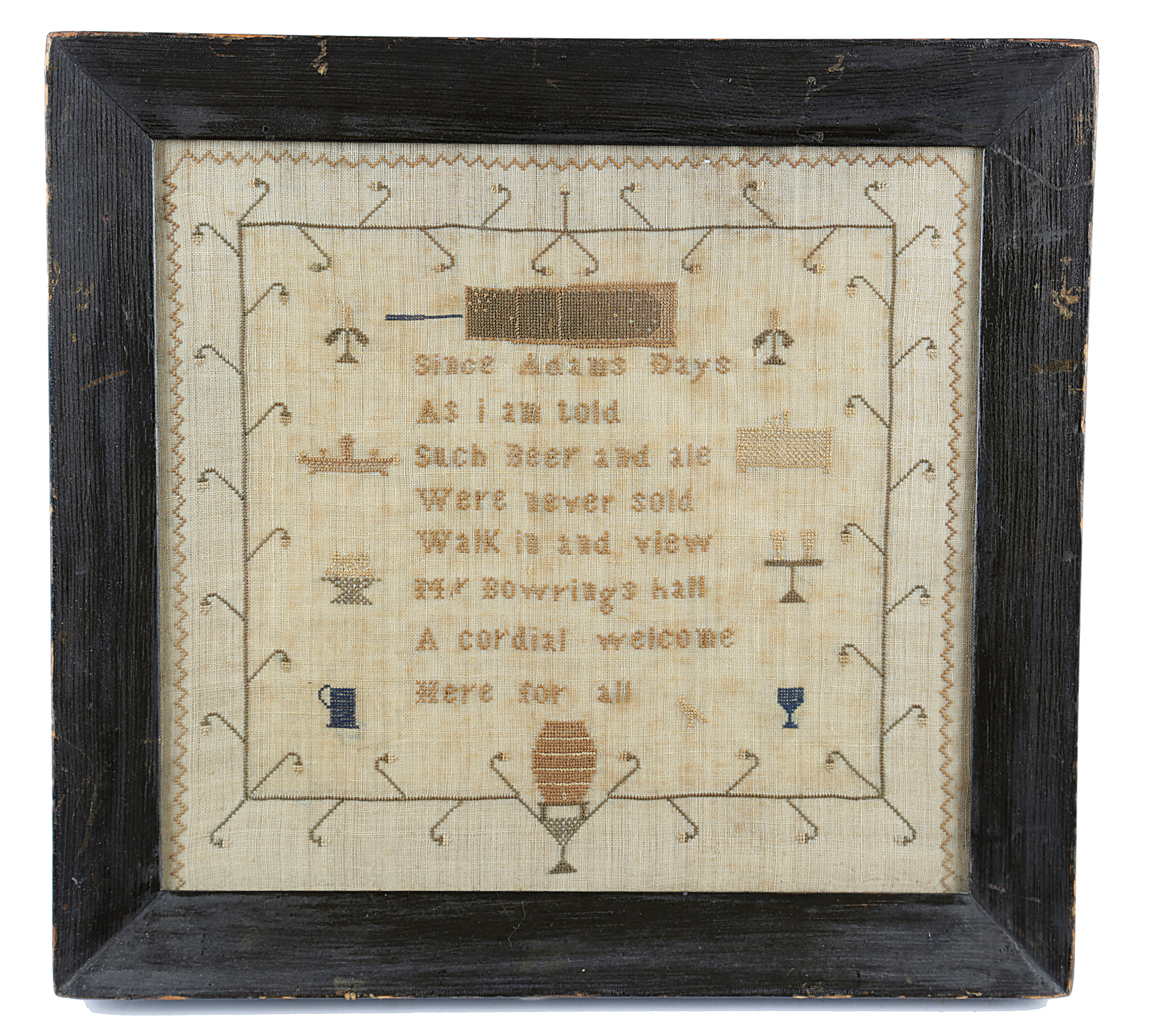 worked with polychrome silk floss on a linen ground, with cross-stitch, decorated with motifs from a public house, including: a tankard, wine glasses, a beer barrel, a bagatelle board and a tobacco honesty box, with a verse 'Sine Adams Days, As I am told, Such Beer and ale, Were never sold, Walk in and view, Mr Bowrings hall, A cordial welcome, Here for all', in a glazed ebonised frame