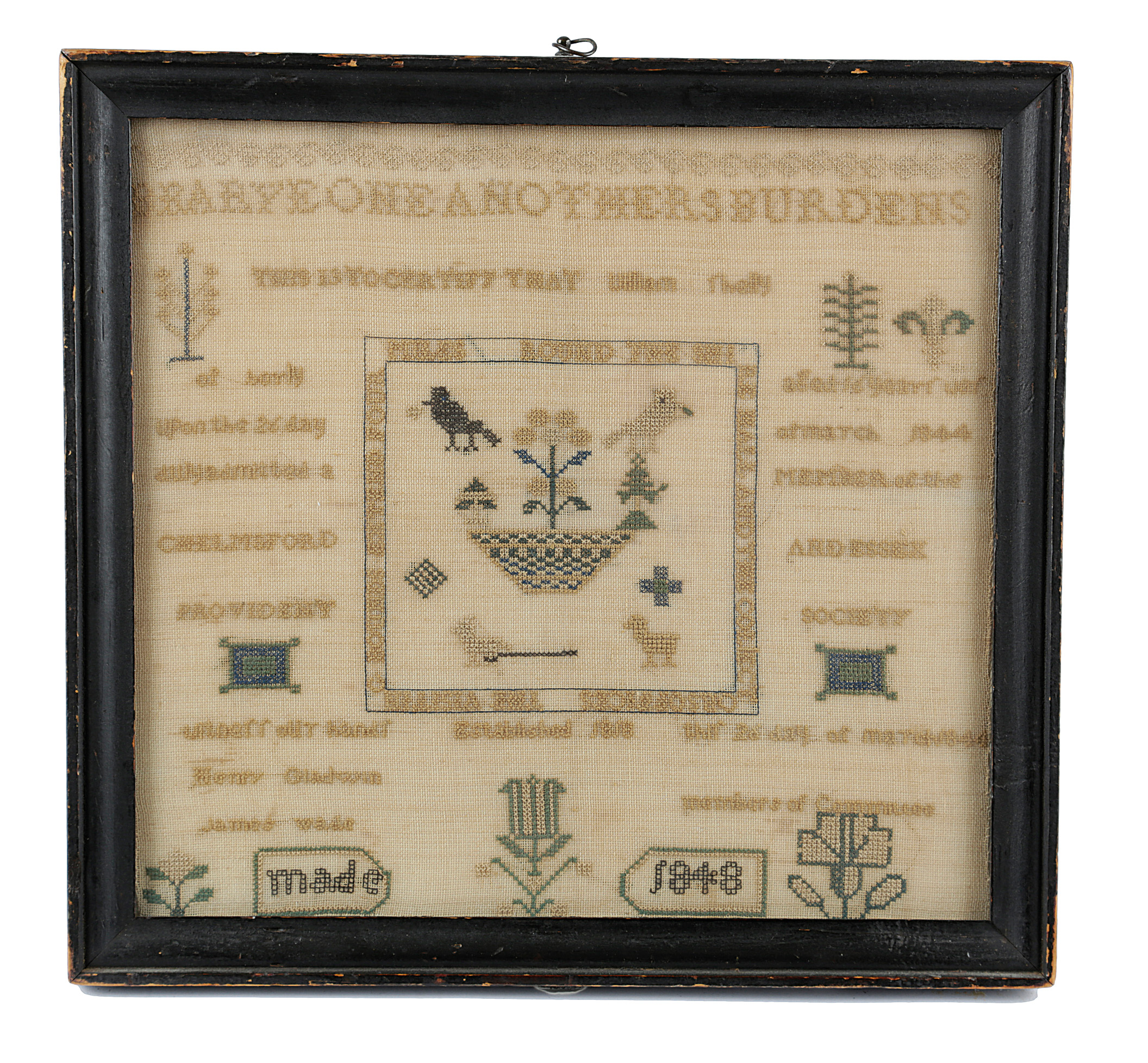 worked with polychrome silk floss on a fine linen canvas, with cross and running stitch, recording the admission of William Shelly to Chelmsford and Essex Provident Society', dated 'made 1848', in a glazed ebonised frame