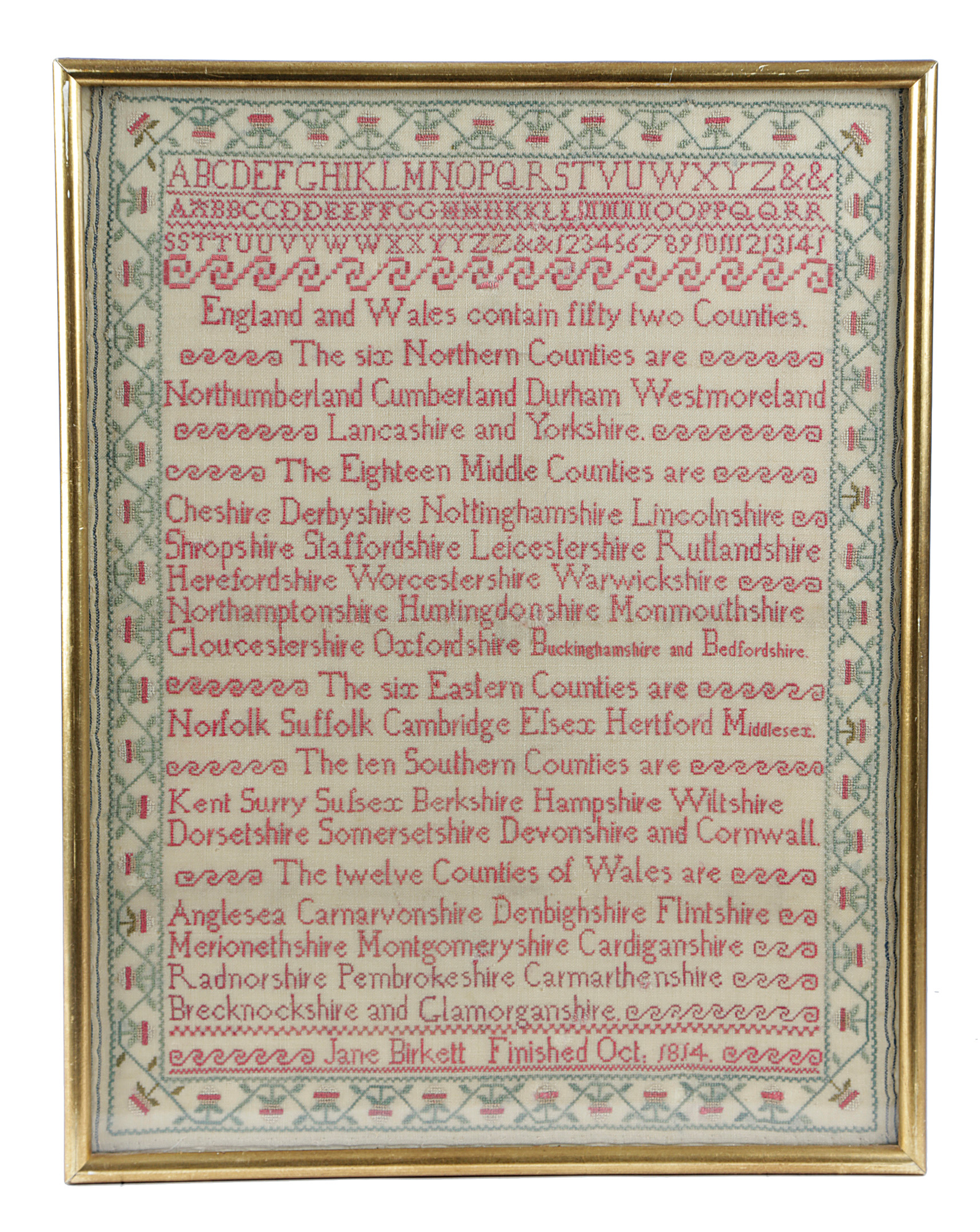 worked with pink silk floss on a tammy ground, in cross, satin and eyelet stitch with alphabets and numerals, titled 'England and Wales contain fifty two Counties', with a list of all the counties, within a strawberry border, signed and dated 'Jane Birkett Finished Oct. 1814', in a later glazed gilt frame