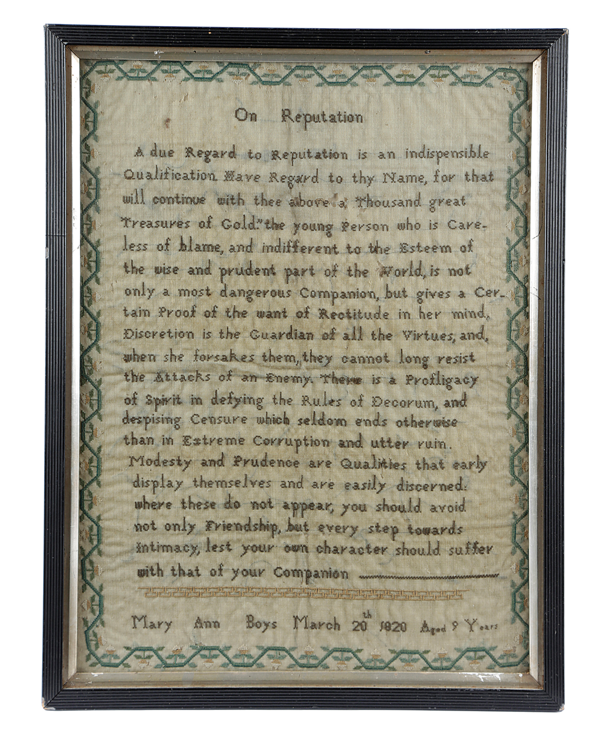worked with monochrome silk floss on a linen ground, with cross stitch, with a text titled 'On Reputation' from 'Letters on the Improvement of the Mind Addressed to a Lady' by Mrs Hester Chapone (1727-1801)', within a floral border, signed and dated 'Mary Ann Boys March 20th 1820 Aged 9 Years', in a later glazed ebonised frame