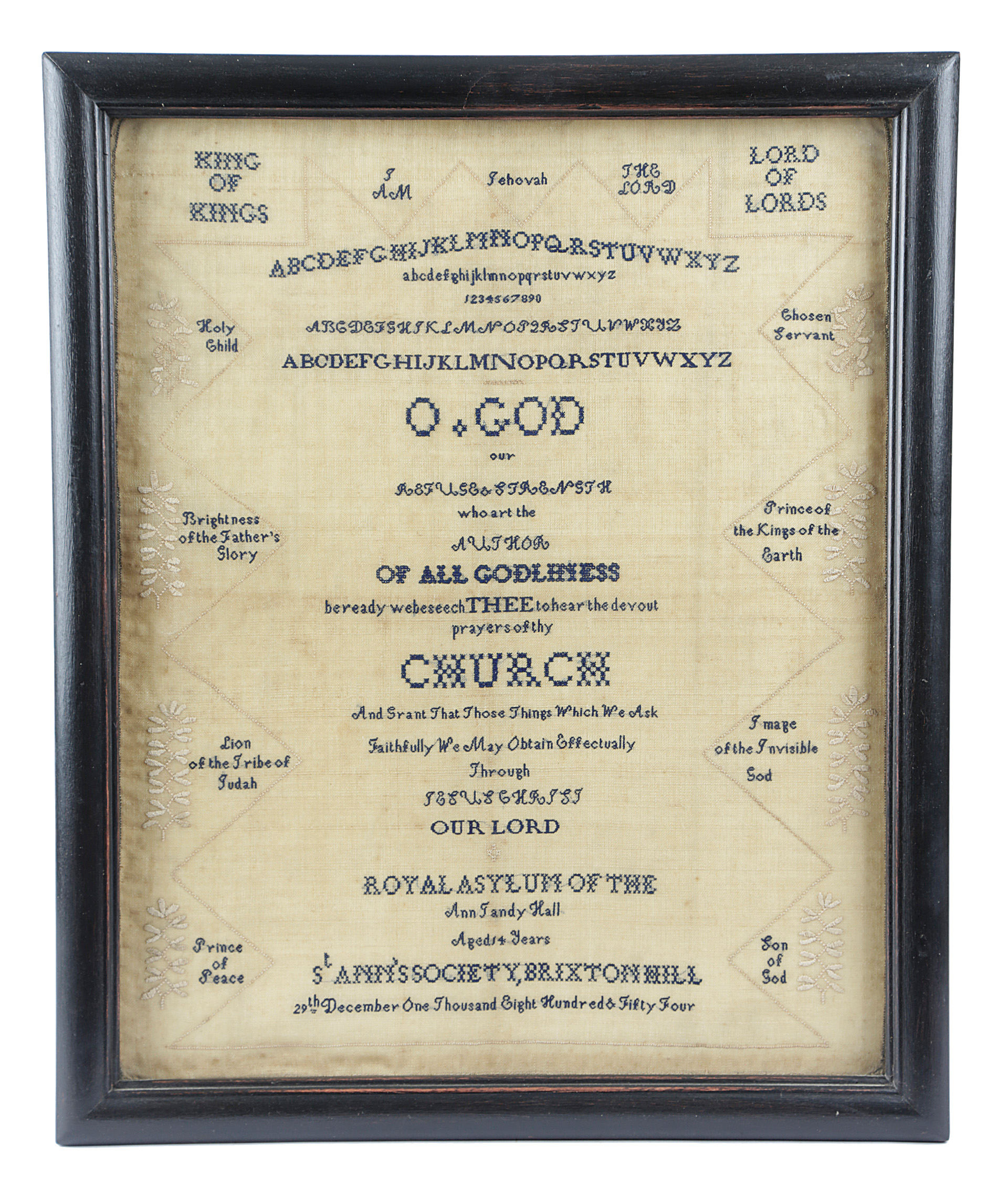 worked with blue silk on a linen ground, with cross stitch, with alphabets and various inscriptions: 'Lord of Lords', 'King of Kings', with floral sprays, signed and dated 'Royal Asylum of the St. Ann's Society, Brixton Hill, Ann Tandy Hall, Aged 14 Years, 29th december One Thousand Eight Hundred & Fifty Four', in a later glazed ebonised frame