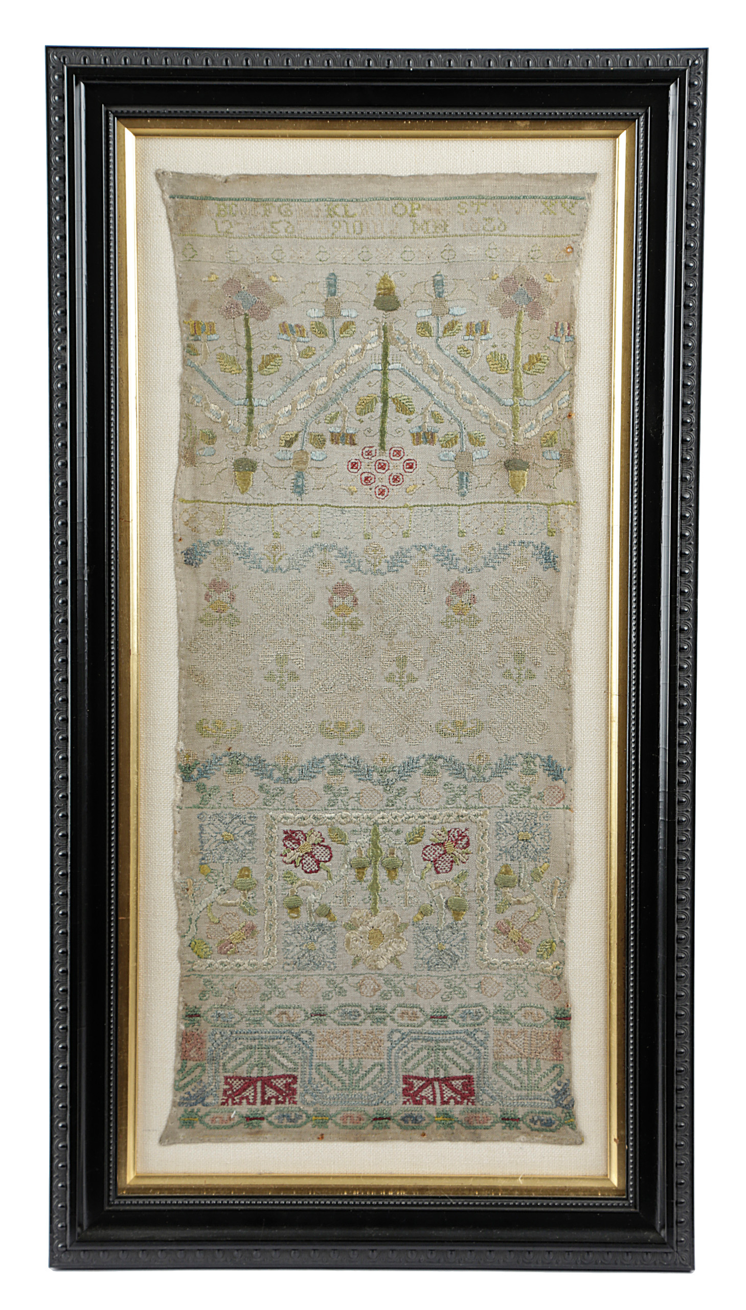worked with polychrome silk floss on an undyed linen ground, with various stitches, including: running, cross, double running, satin, long armed cross and detached buttonhole, with broad bands, the top with an alphabet and numerals, with initials and the date 'M H 1686', above a band of acorn motifs and leaves, a trellis band and further flowers, in a later glazed ebonised frame
