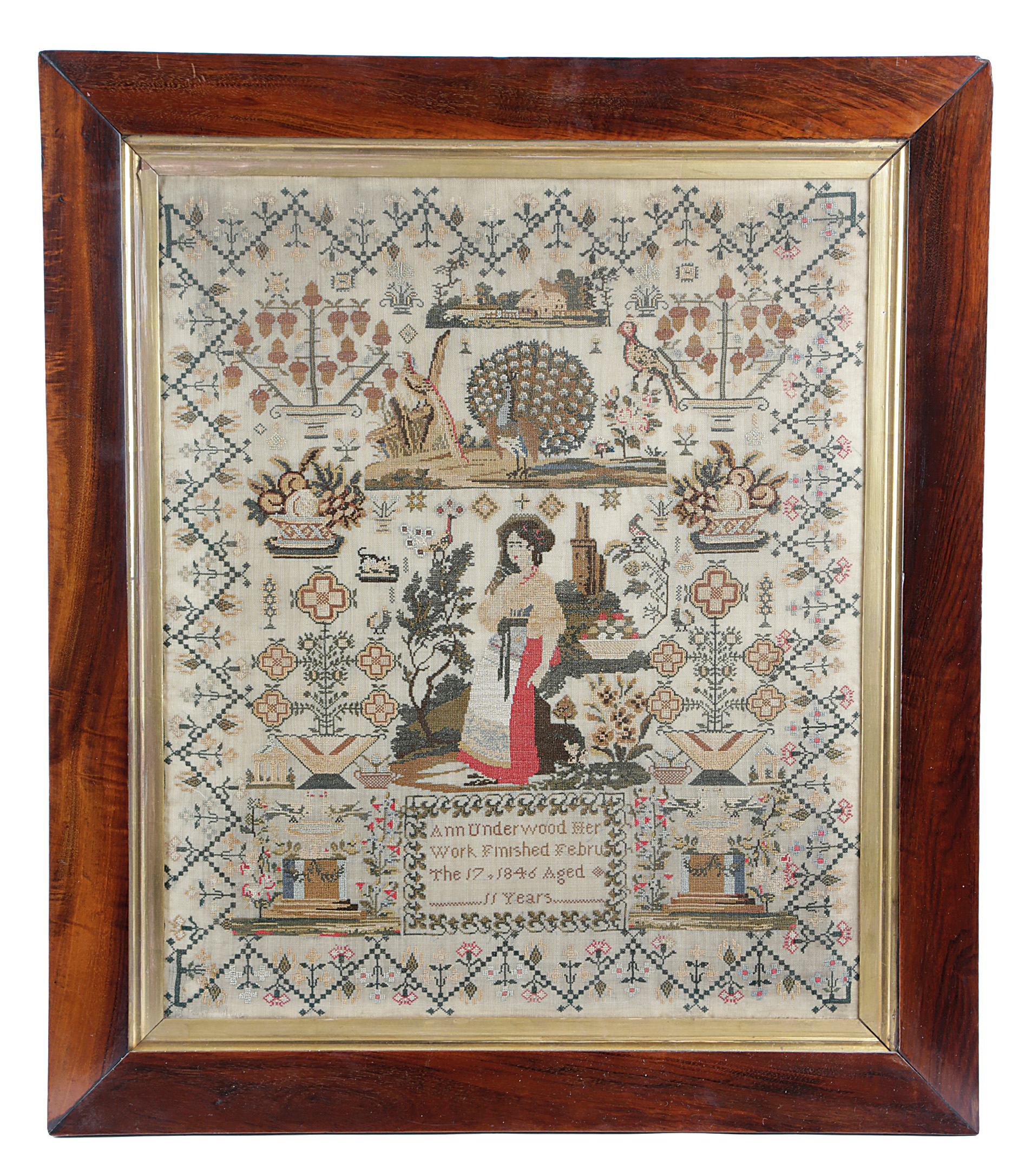 worked with coloured silks on a linen ground, with various techniques and stitches, with baskets of fruit, a view of a house and a church, a peacock, urns of flowers and with a central Italian lady in national costume beside a folly tower, signed and dated 'Ann Underwood Her Work Finished Febru.. The 17 1846 Aged 11 Years', in a glazed goncalo alves frame