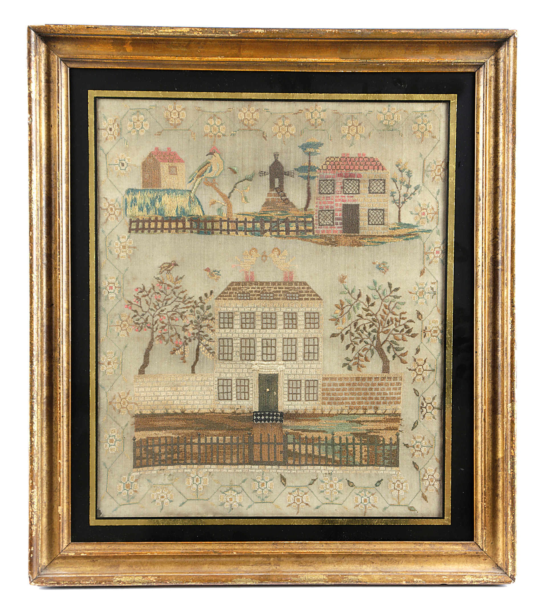 worked with coloured silks and wools on a fine linen ground, with a house flanked by trees and with a pair of angels, with further houses and a folly, with an exotic bird perched in a tree, within a floral border, unsigned, in a glazed verre eglomise and gilt frame