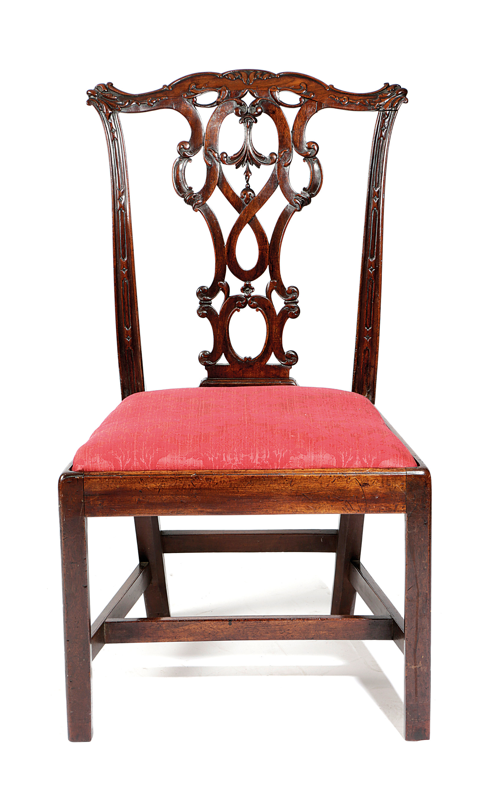 the serpentine top rail carved with 'C' scrolls, husks and leaves, above a pierced and interlaced vase shaped splat, the uprights carved with Gothic designs, above a drop-in seat, on moulded and chamfered legs united by an 'H' stretcher