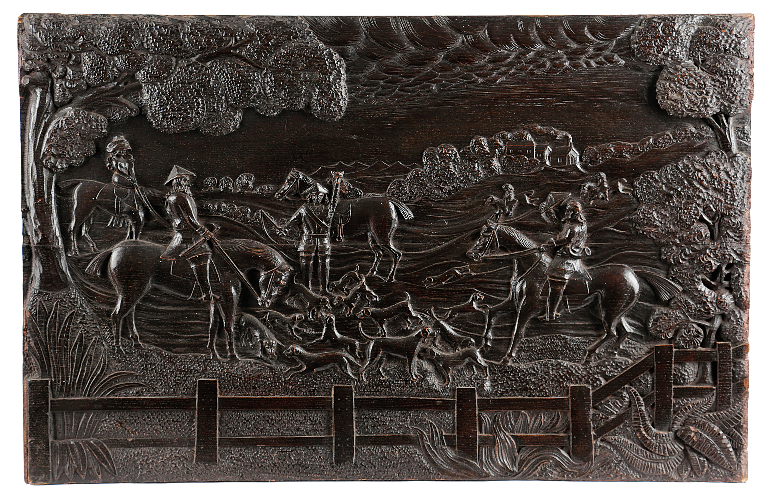 AN OAK RELIEF CARVED FOX HUNTING PANEL