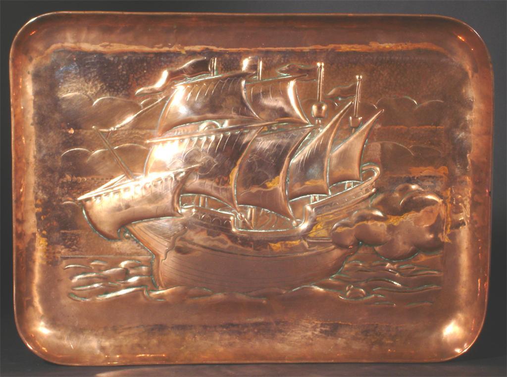 A rare Newlyn copper tray decorated with a warship at full sail, firing a cannon stamped Newlyn 31 x 23.5cm