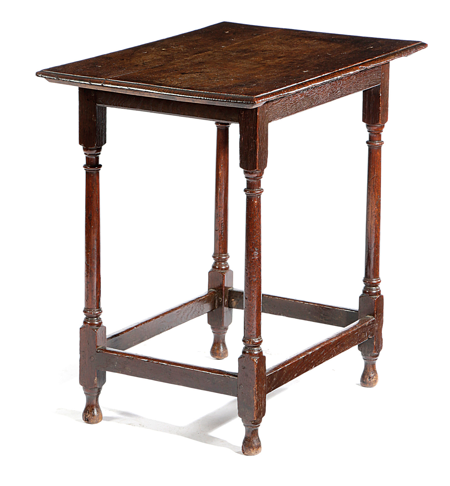 the rectangular top with a moulded edge, on slender baluster legs united by peripheral stretchers